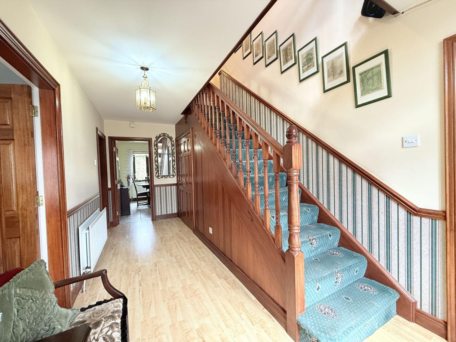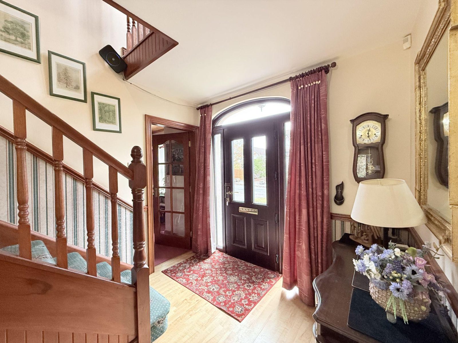 Entrance Hall: A bright, spacious and elegant entrance hall with composite front door. Impeccable design throughout with laminate wooden flooring; leading to carpet stairwell. Measurements: 5.38m x 2.51m.