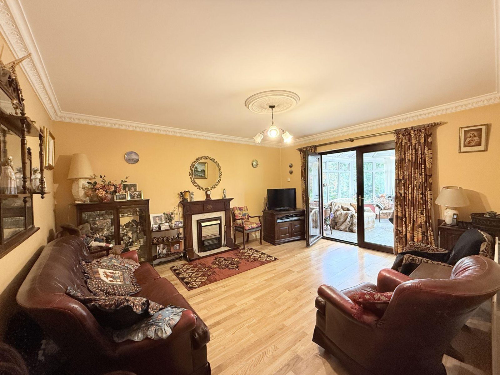 Family Room: An elegant and delicately decorated spacious reception room with laminate flooring, ceiling coving and electric fire. Double doors to conservatory. Measurements: 3.89m x 4.56m.