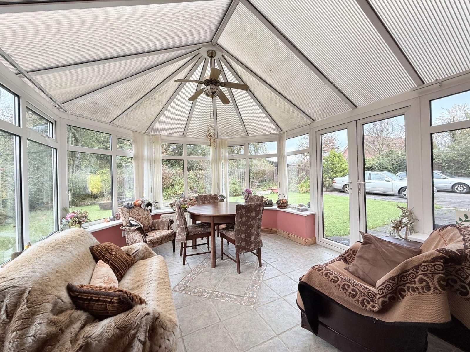 Conservatory: Bright, spacious living area with tile flooring, double doors from family room and French patio doors to property rear. Measurements: 3.77m x 4.16m.