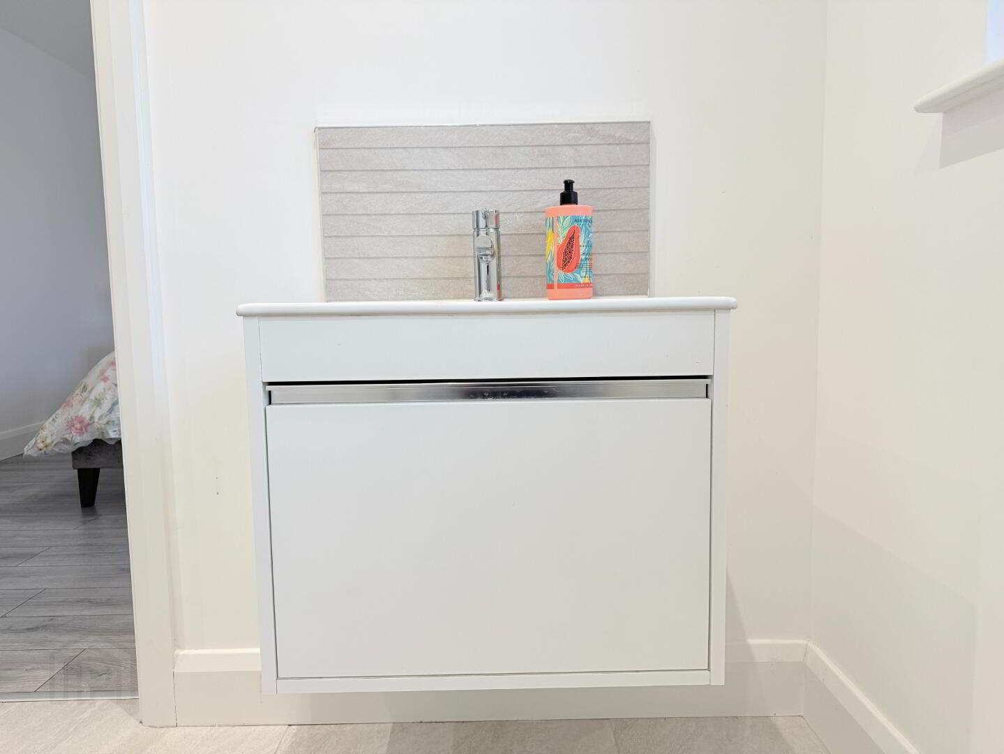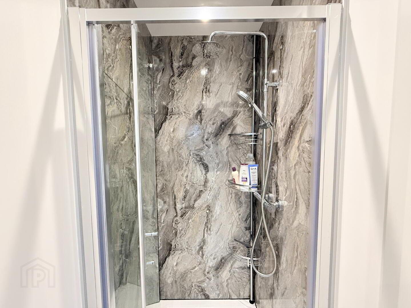 En-Suite: Three-piece suite with vanity unit and power shower.