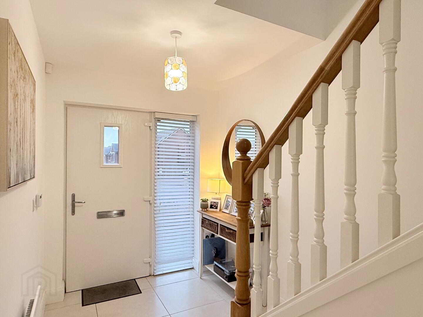 Bright and welcoming hallway with composite front door and full-height side window allowing natural light to flow through. Modern tiled flooring and staircase with luxurious carpet finish. Under-stair storage.