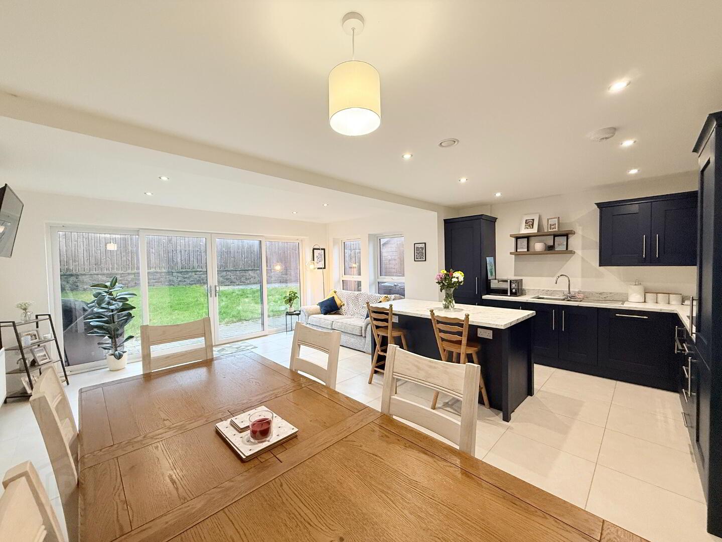 The well-designed layout comprises three generous bedrooms (including a master with en-suite), a spacious lounge, and a magnificent open-plan kitchen, dining and living area with sliding patio doors opening to the rear garden. Additional features include a ground floor WC and a modern family bathroom, all finished with high-quality sanitary ware throughout.