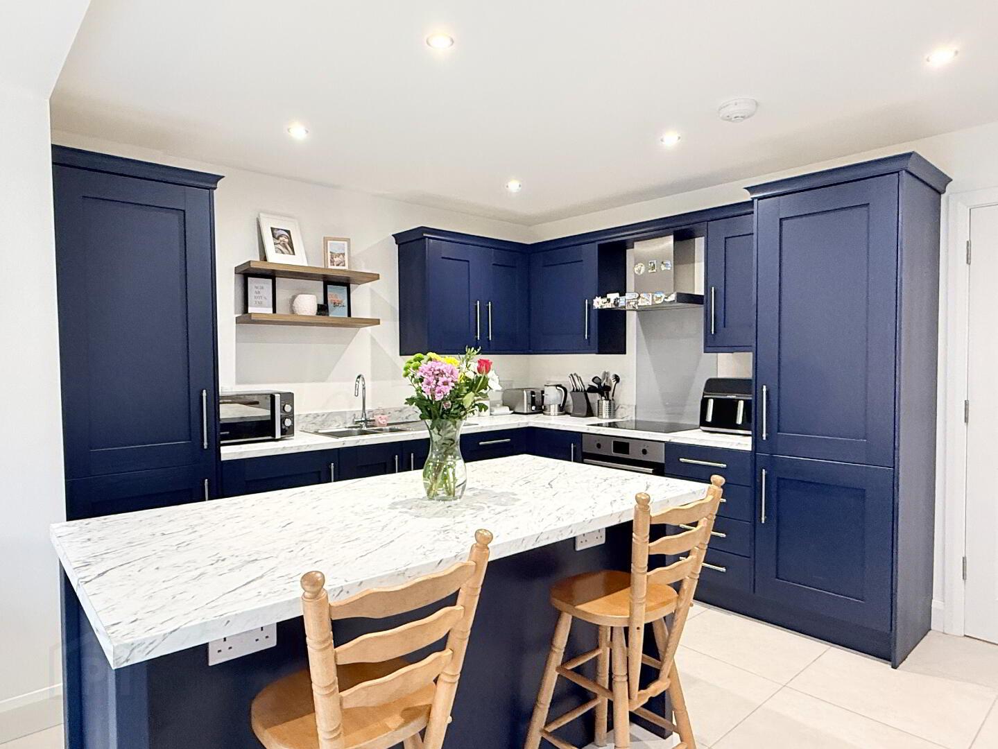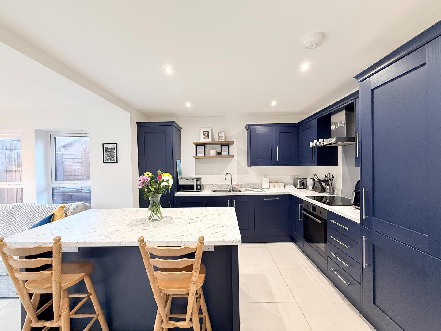 Open-plan kitchen/dining area with tiled flooring. High-spec kitchen featuring solid wooden high- and low-level units, laminate worktops and upstands. Integrated appliances include a 4-ring induction hob, oven, dishwasher, fridge/freezer and combi washer/dryer (all included in the sale). Centre peninsula with built-in storage, seating for three and electric supply.