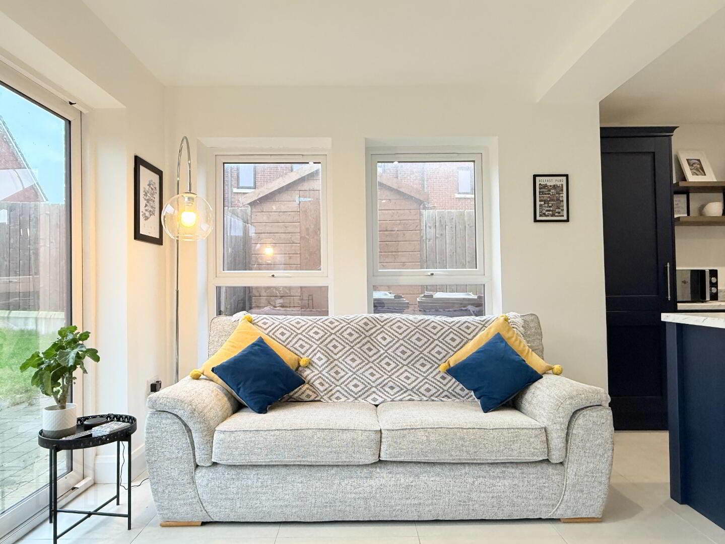The standout feature of the home, offering a superb living space off the kitchen. Large sliding patio doors with side windows provide an impressive four-metre glazed area, flooding the room with natural light.