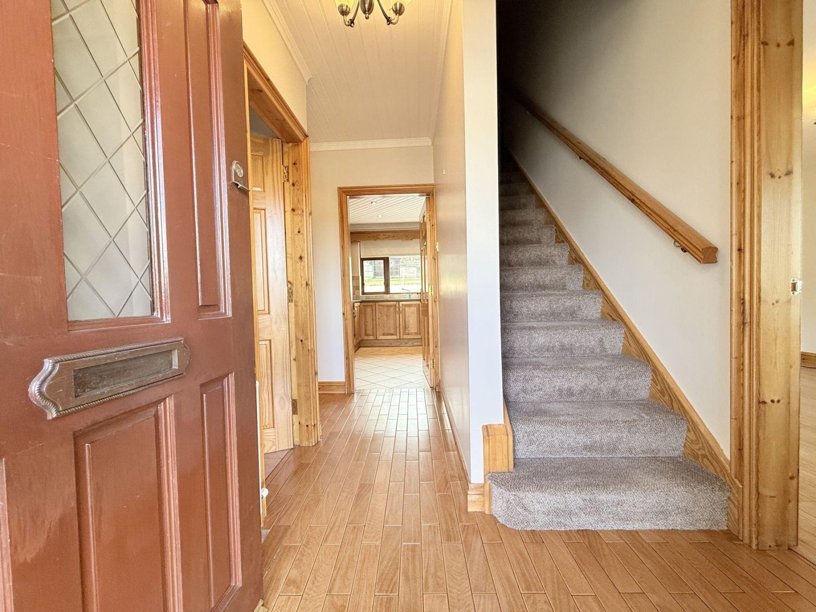 Entrance Hallway: Welcoming entrance with tile flooring leading to carpet stairwell.