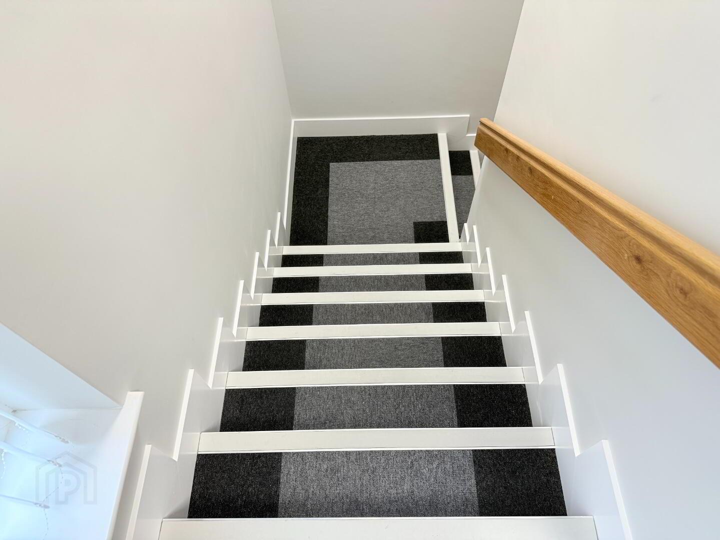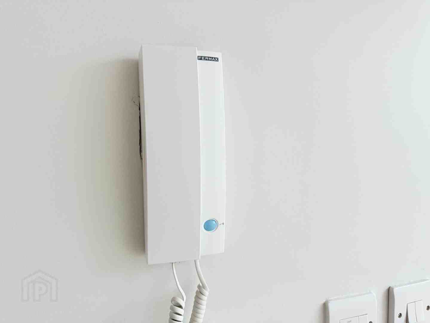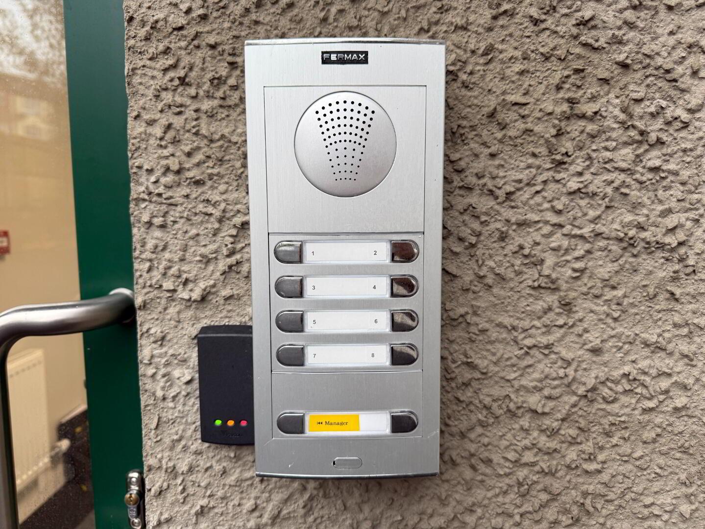 Secure external door with buzzer system, automated lighting, carpeted hallway, lift and staircase access to the first floor.