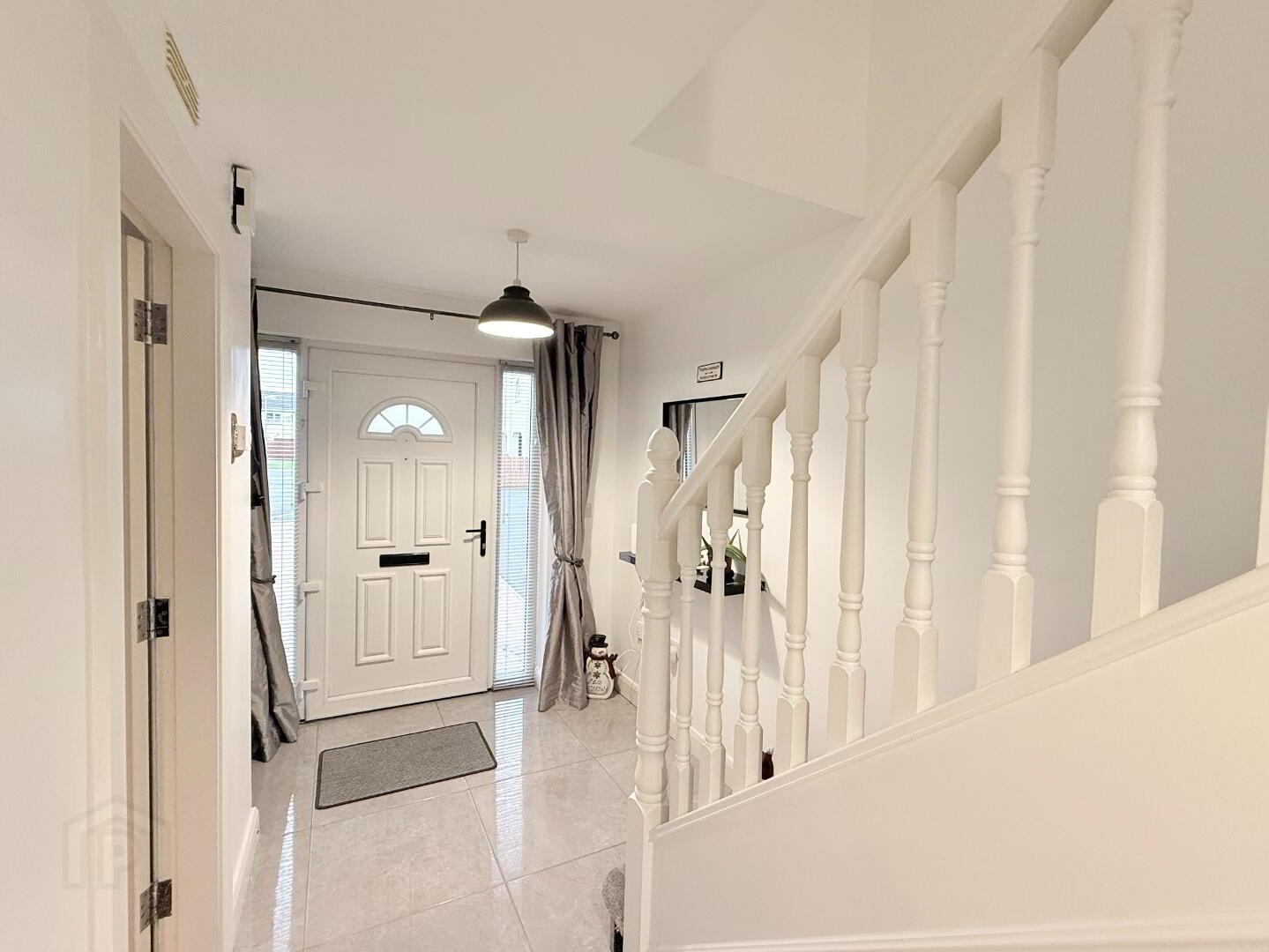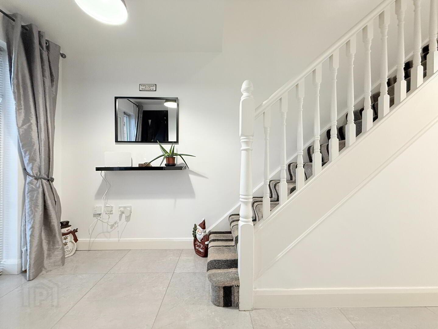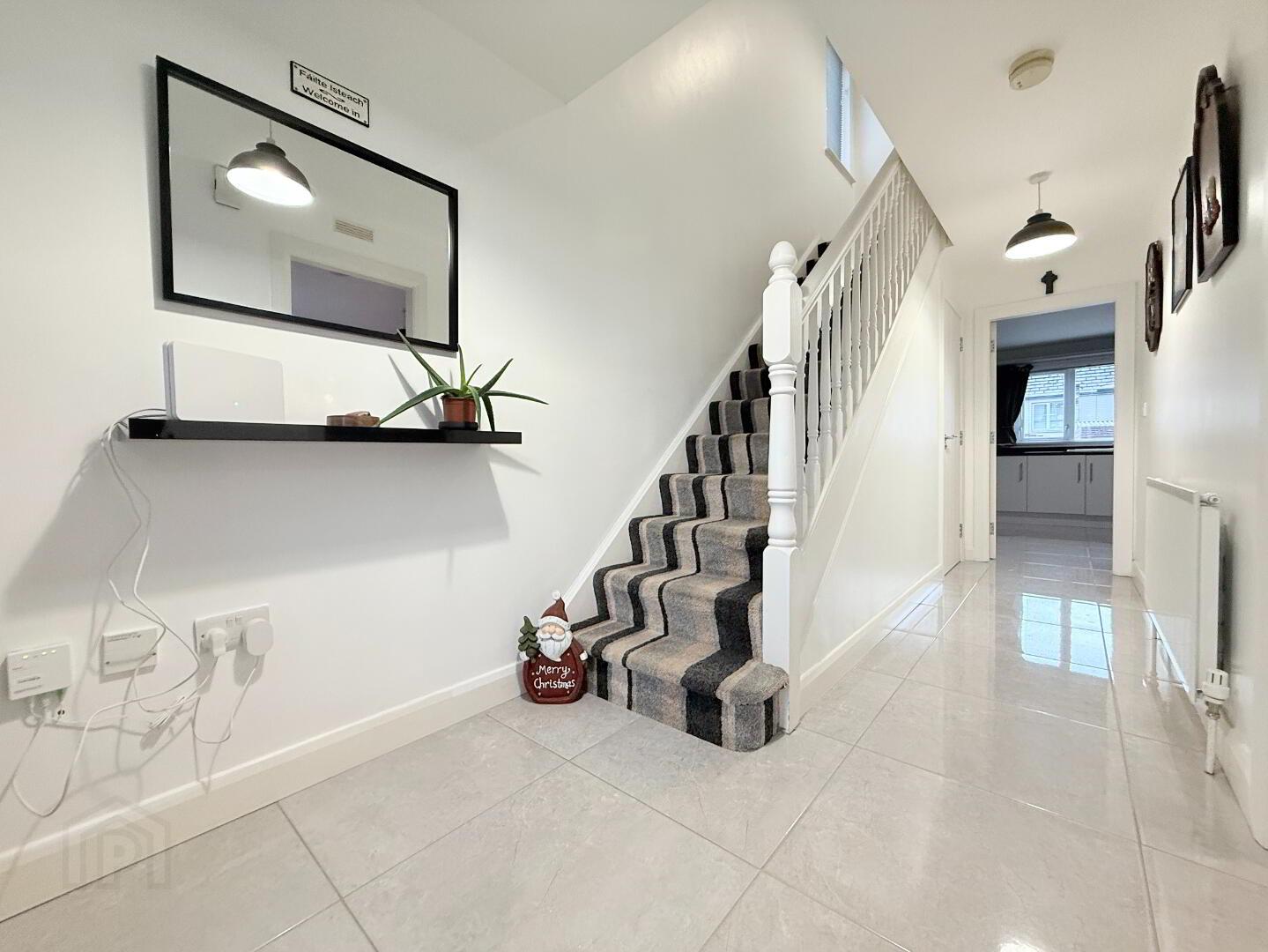 Entrance Hall: Bright spacious entrance hall with composite front door. Modern tile flooring, solid wooden staircase with carpet stairwell. Measurements: 5.63m x 1.88m.