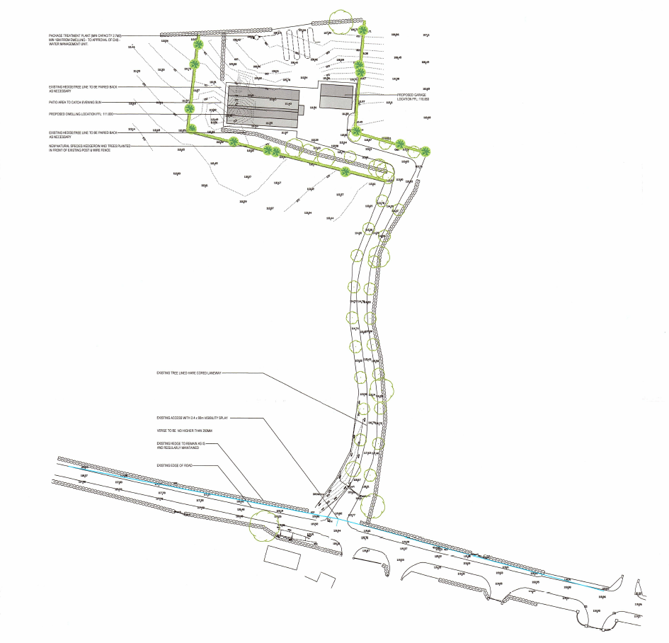 A long private lane has been constructed, lined with 26 mature hornbeam trees planted over a decade ago, creating an impressive and established approach to the property. A service duct containing water and telecoms runs alongside the lane, complemented by a 6‑inch drainage pipe. Additional ducts have been installed at each tree pair to accommodate future lighting.