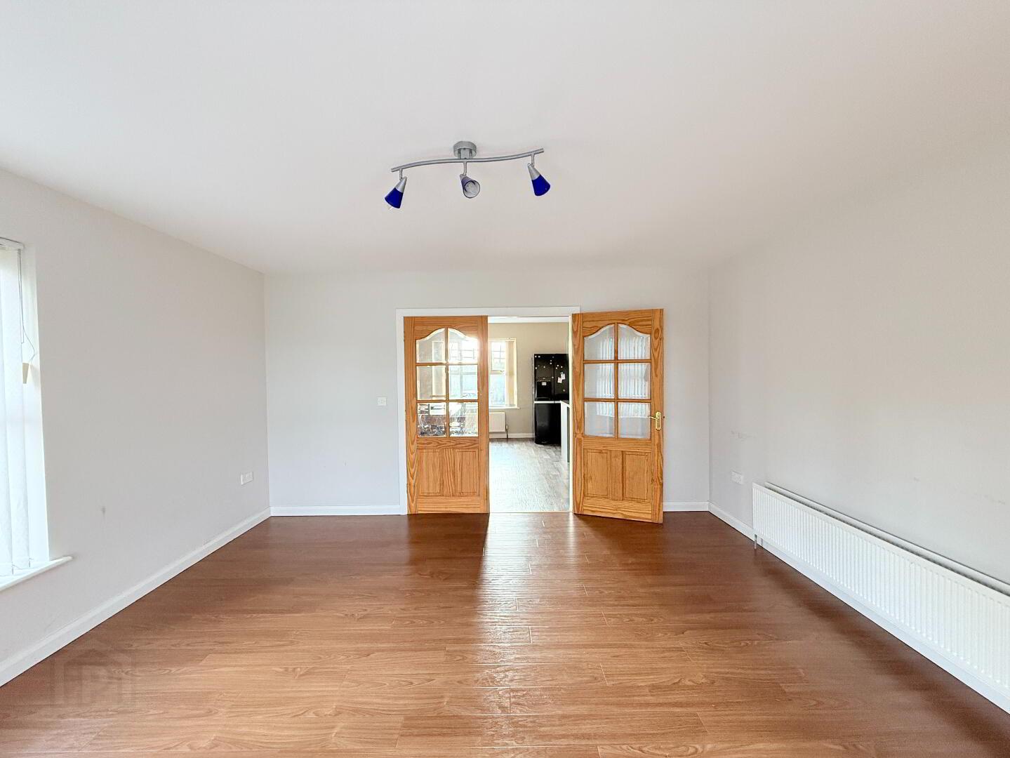 Living Room: An elegant and delicately decorated spacious reception room with laminate flooring, double door access to kitchen / dining area. Measurements: 4.43m x 4.39m.