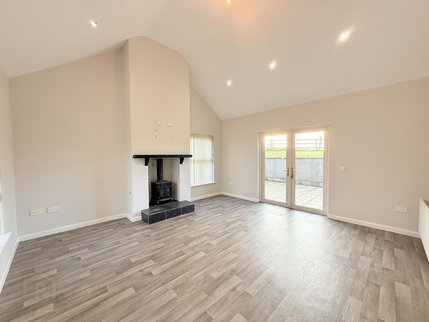 Family Room: Ideally located off the kitchen with vaulted ceiling, multi-fuel stove on raised tile hearth with French doors leading to rear patio area. Measurements: 5m x 4.79m.