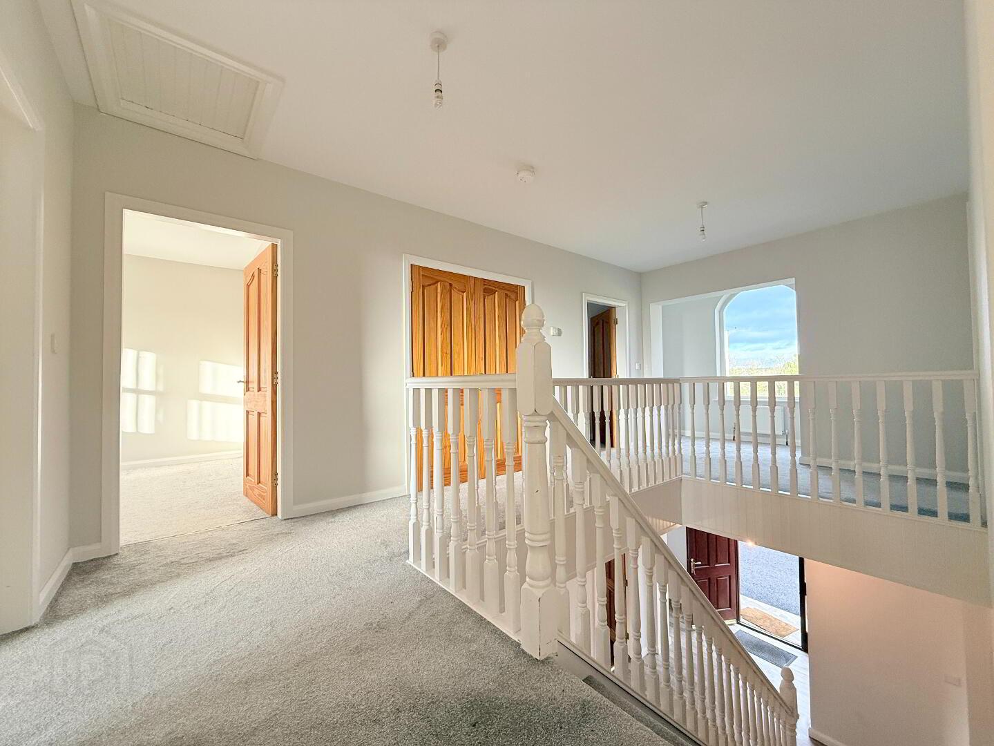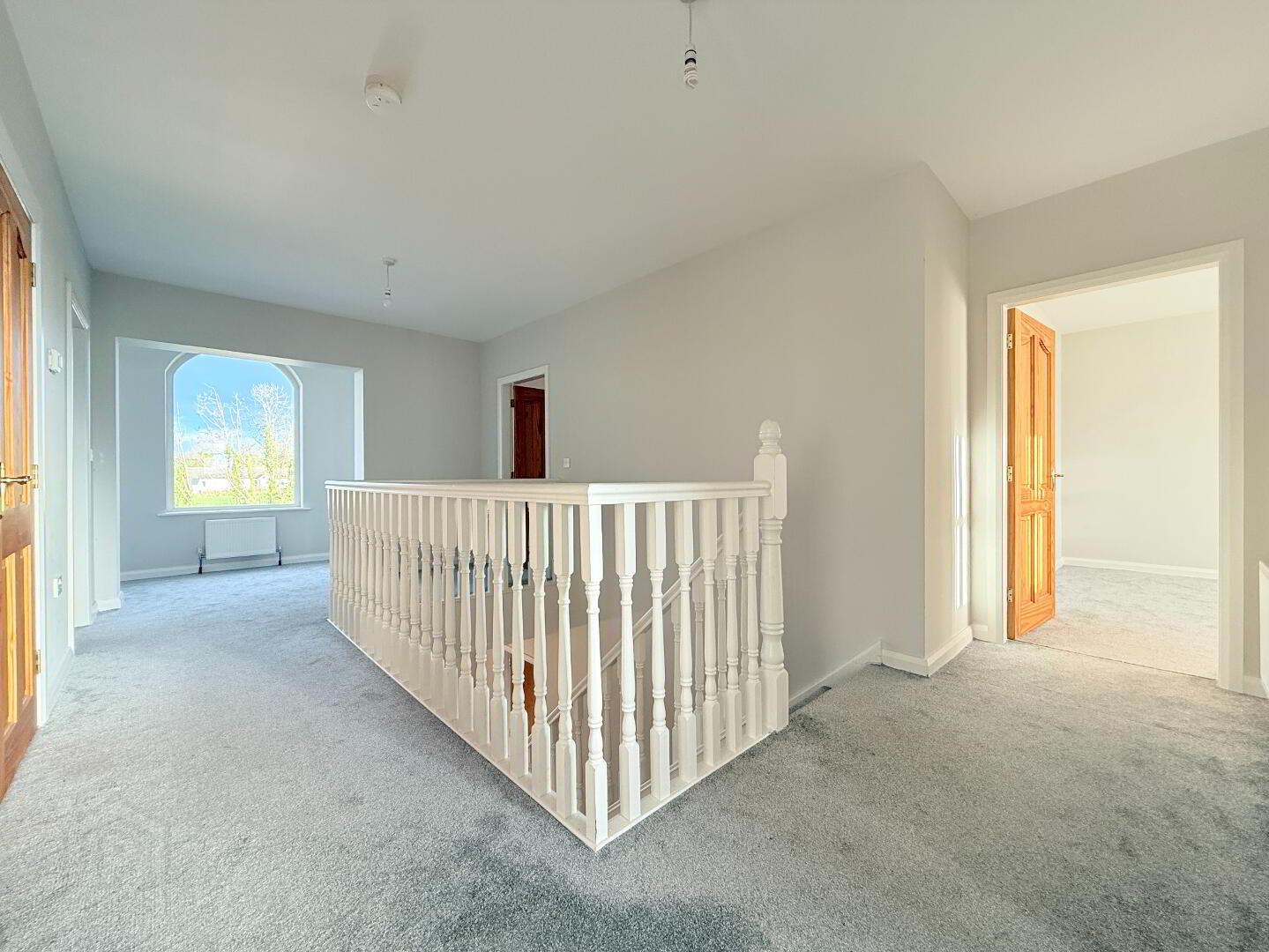 Landing Area: A bright and spacious landing with gallery area and feature window, complete with carpet flooring.