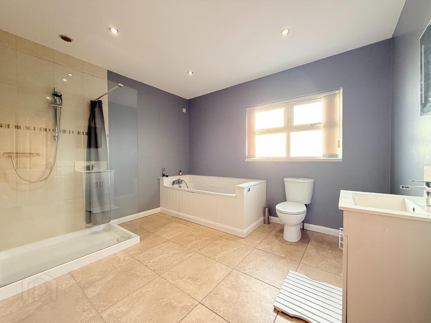Family Bathroom: An elegant family bathroom suite with tile flooring, free standing bath and walk-in power shower. Measurements: 3.45m x 2.97m.