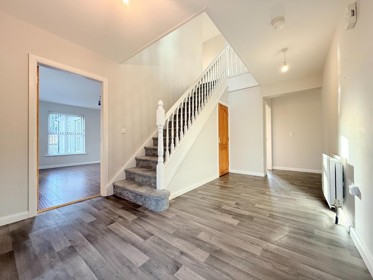 Entrance Hall: A bright, spacious and elegant entrance hall with wooden front door; leading to painted staircase with under stair storage and carpet stairwell. Measurements: 7.40m x 3m.
