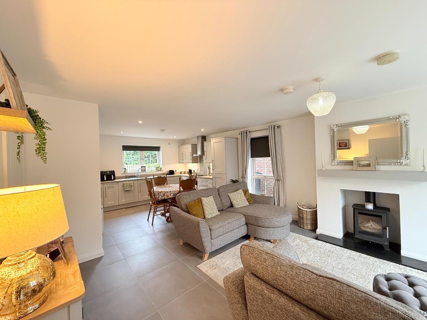 Generous open plan living room featuring modern tiled flooring with woodburning stove and large frontal window allowing natural ligt to flow through.