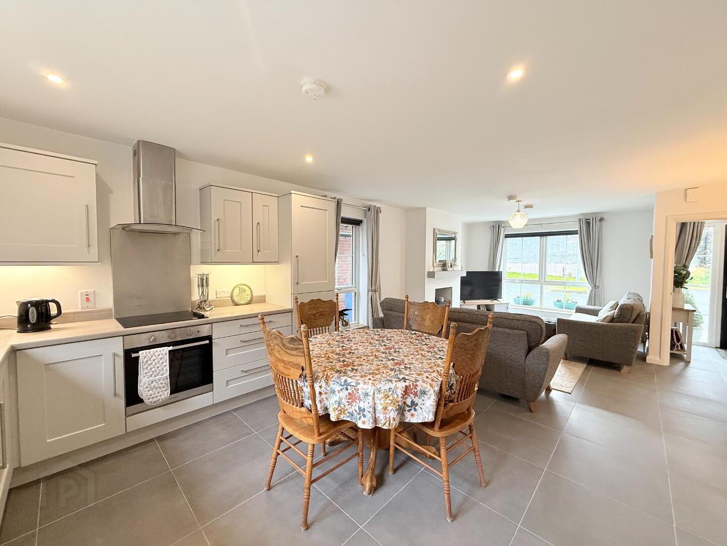 Spacious open-plan area with modern tiled flooring throughout. The beautiful U-shaped kitchen is fitted with high- and low-level units and laminate worktop. Integrated appliances include a fridge/freezer, dishwasher, four-ring hob, and oven.