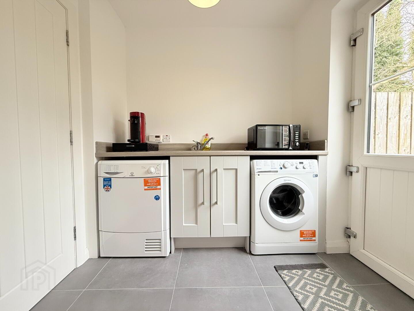 Located off the kitchen, tiled flooring with low and high level units and laminate worktop, plumbing for a washing machine and tumble dryer, with rear door access.
