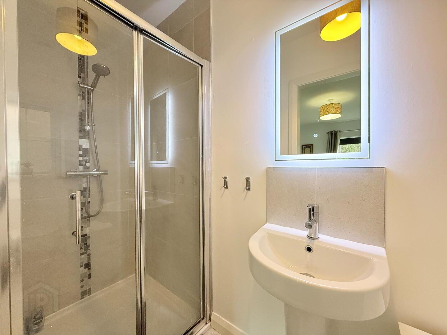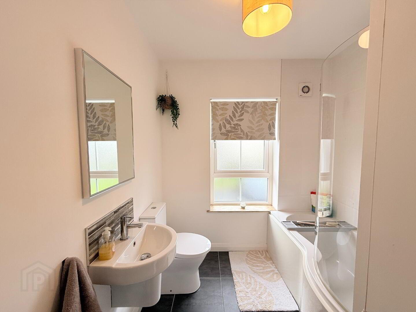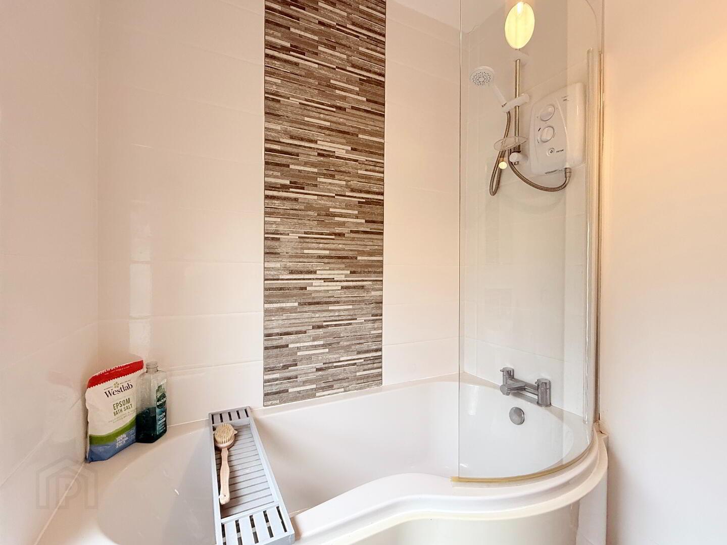 Stylish three-piece suite with high-quality sanitary ware, tiled flooring and electric shower over bath.
