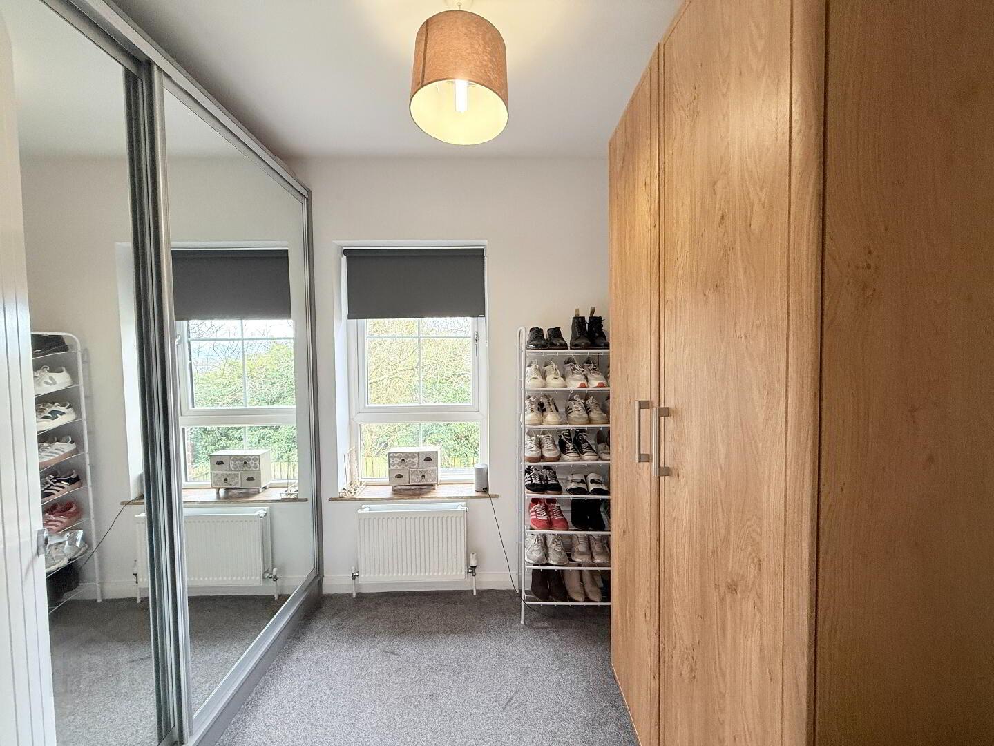 Rear-facing bedroom with carpet flooring and bespoke slide robes.
