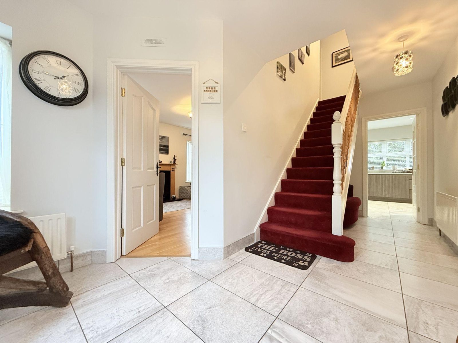 Entrance Hall: A bright, spacious and elegant entrance hall with solid wooden front door. Impeccable design throughout with modern tile flooring; leading to staircase complete with carpet. Measurements: 5.53m x 3.40m.