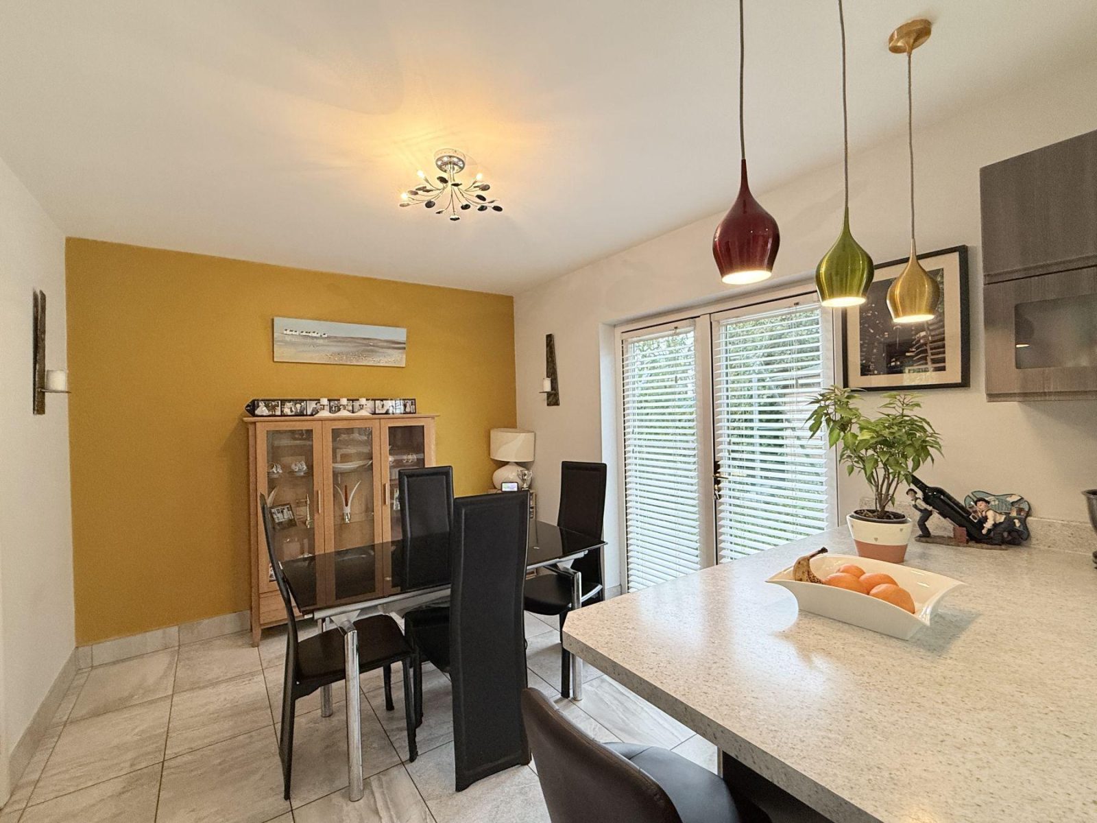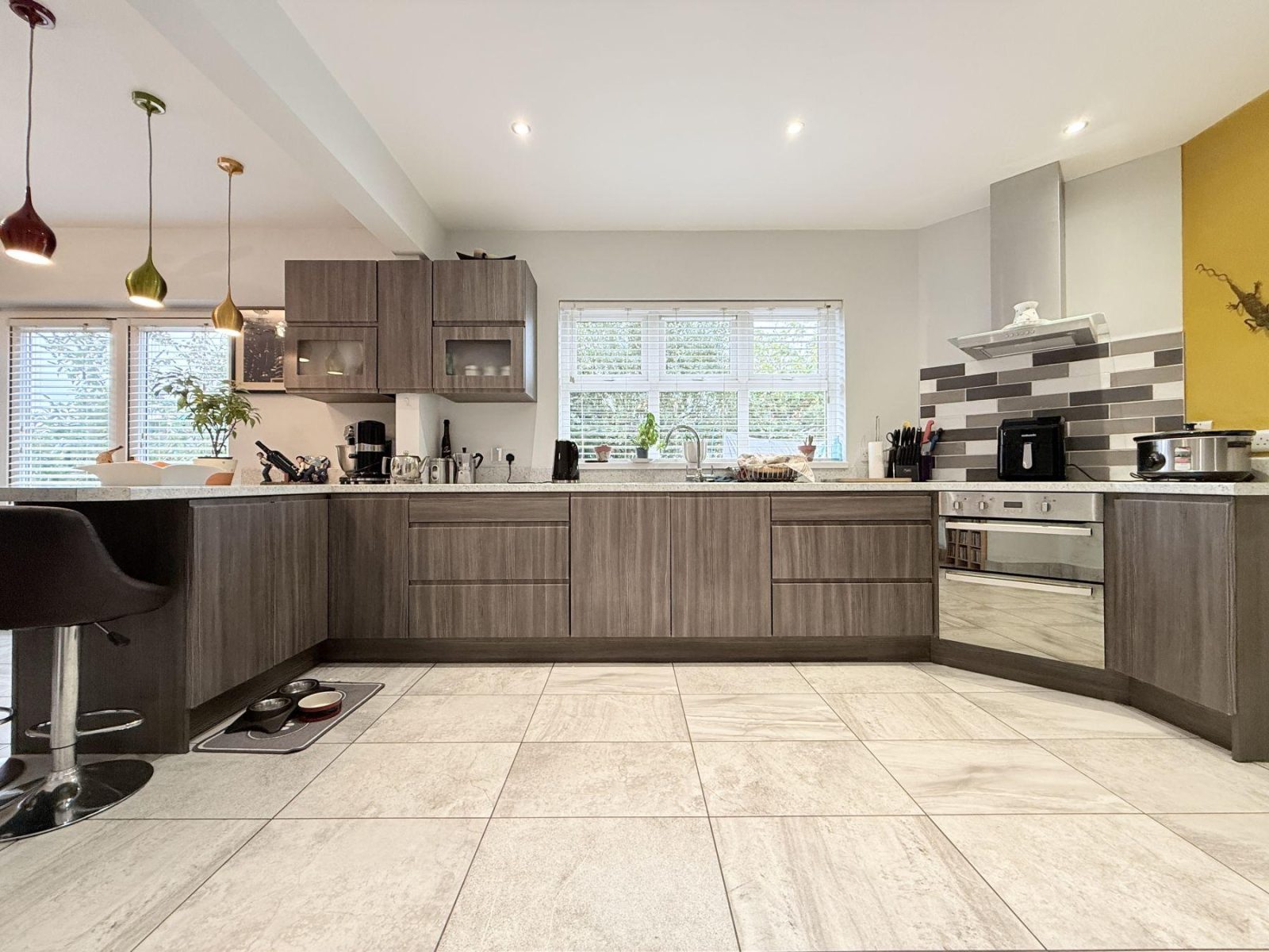 Kitchen / Dining: A spacious, open plan kitchen / dining area, tile flooring throughout with French patio doors to access rear patio area. A high specification kitchen, low-and high-rise kitchen units complete with laminate worktops and tile splashback with 4 ring hob and oven. Measurements: 7.84m x 3.43m.