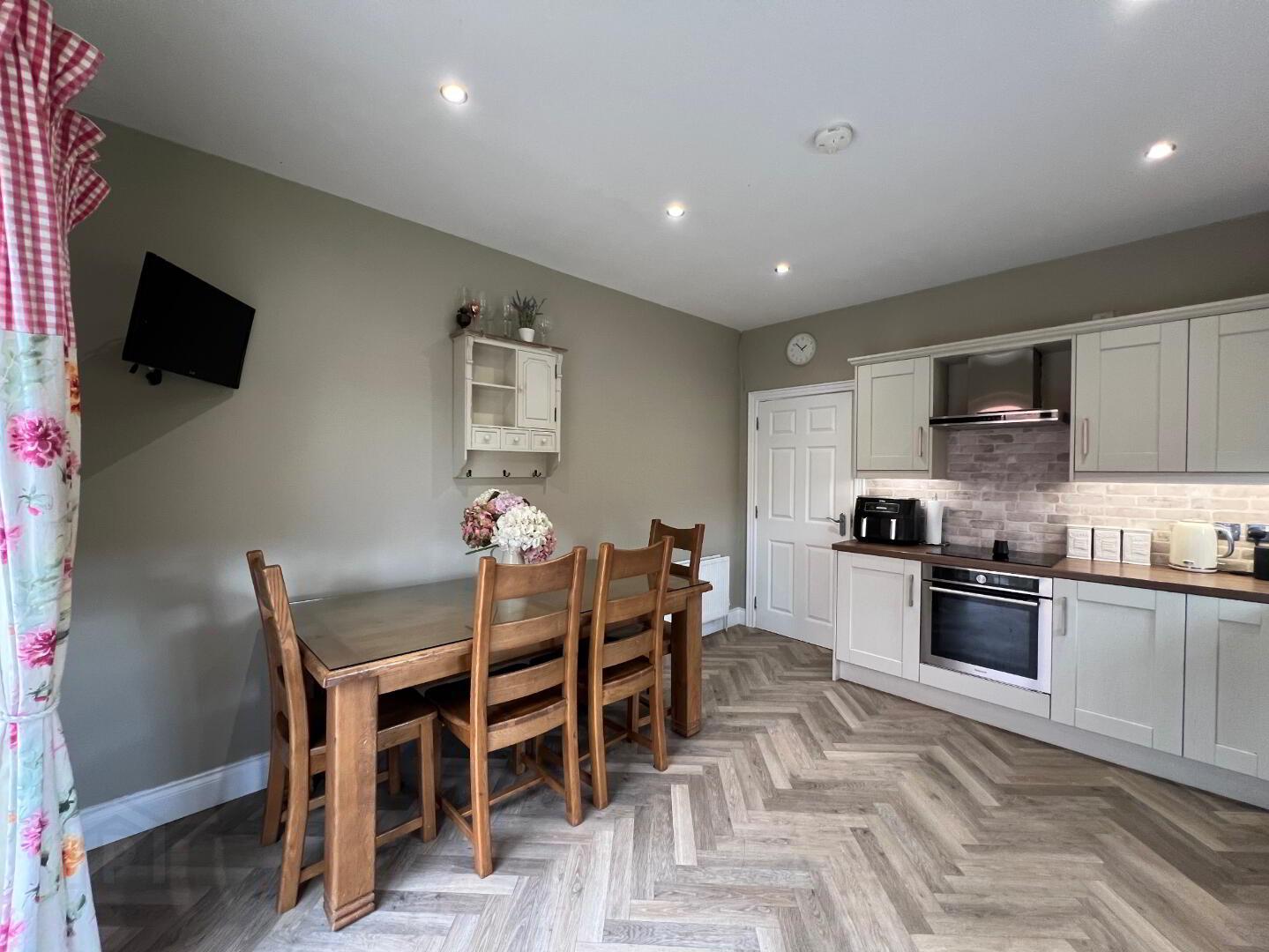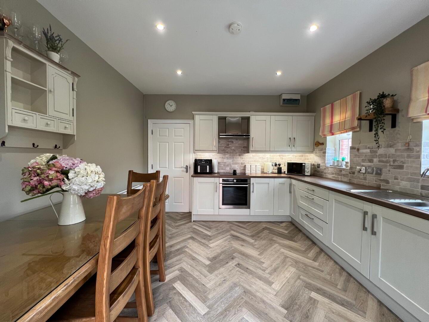 Kitchen/Dining Room: A spacious cream kitchen / dining area with modern grey tile flooring, low- and high-rise kitchen units complete with quartz. Integrated appliances include; fridge freezer, dish washer, four ring hob / oven and washing machine with sliding patio doors leading onto the patio area.