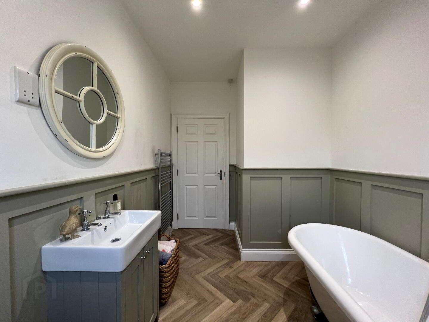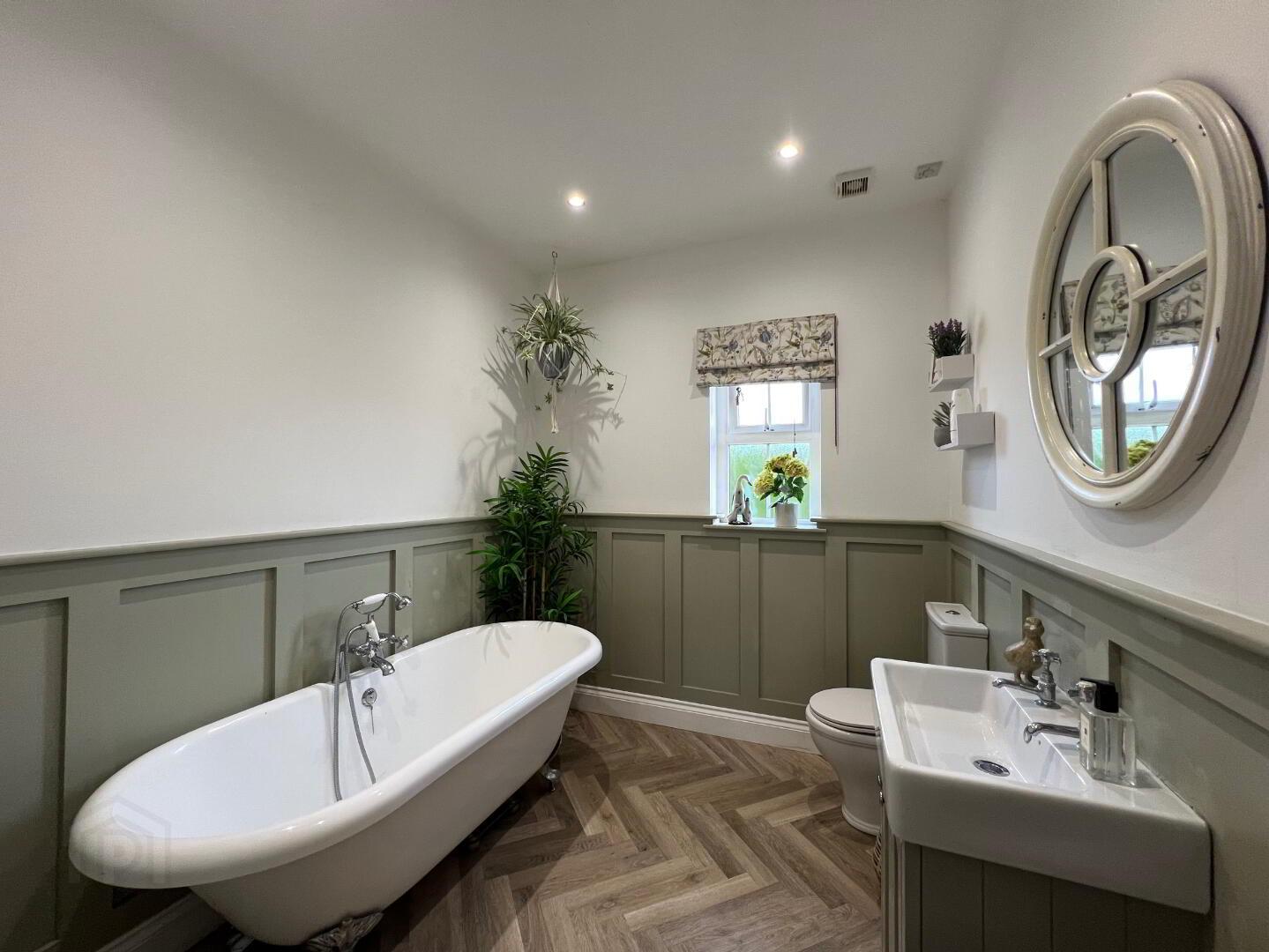Bathroom: An elegant and contemporary finished three-piece bathroom suite with luxurious free standing bath.. High quality sanitary ware, heated towel rail complete with tile flooring and wood panelling. Measurements: 3.73m x 2.24m