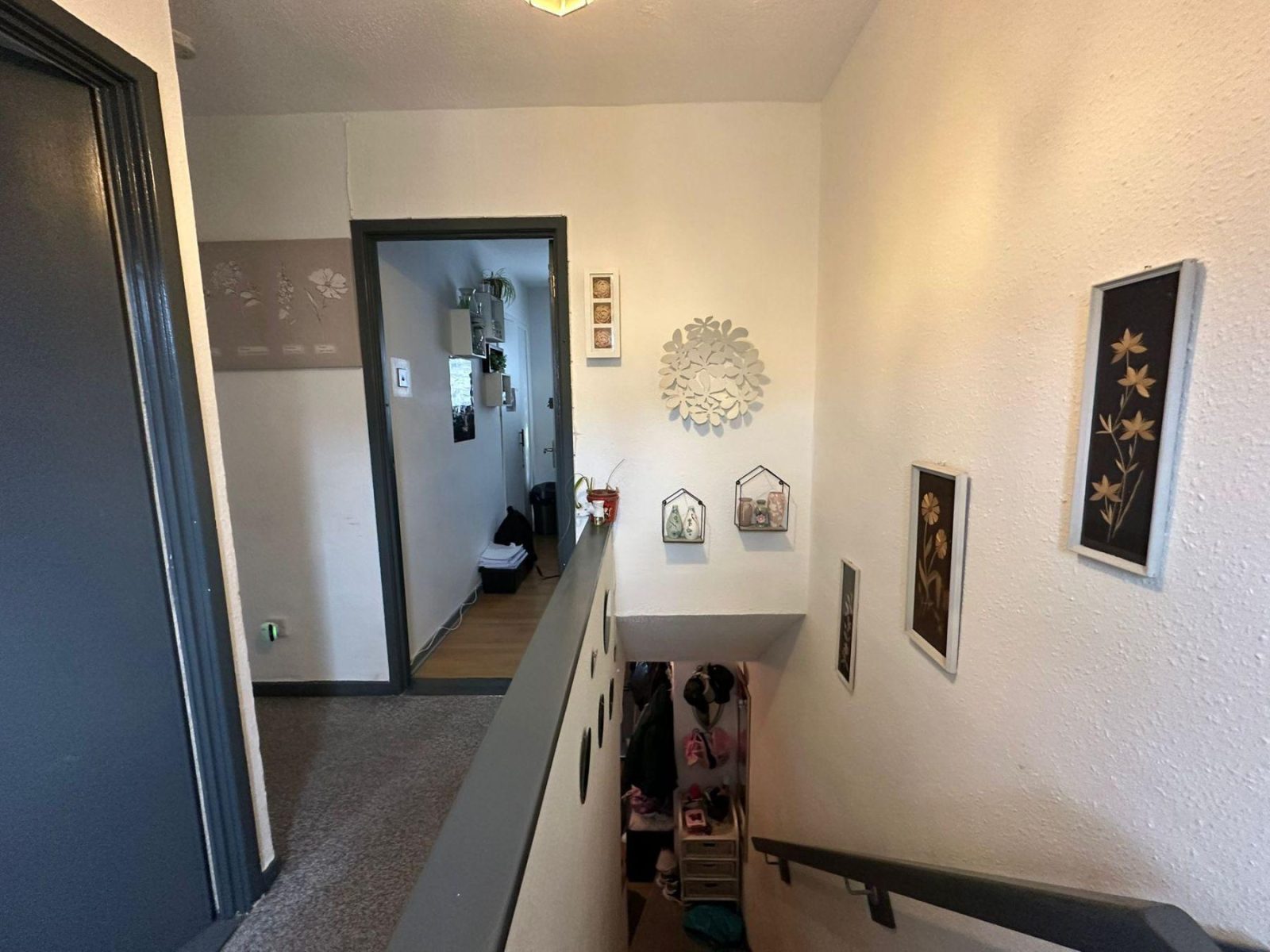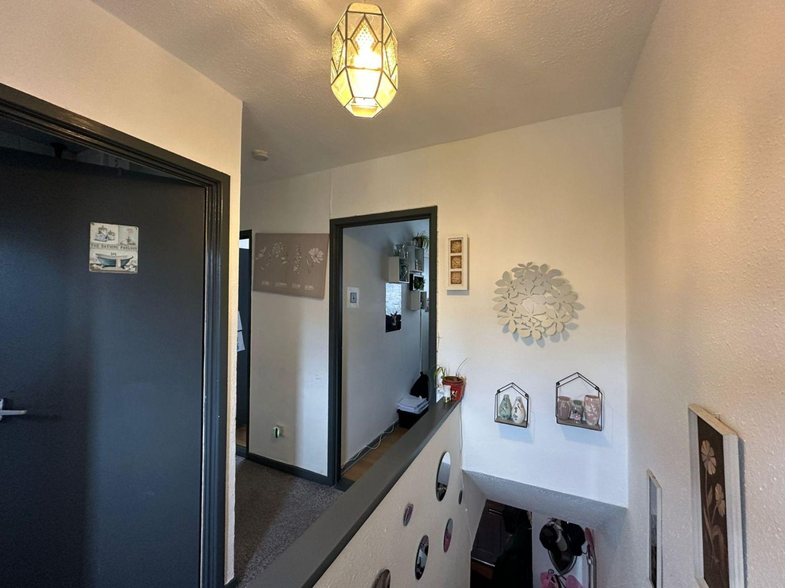 Stairwell: Painted wooden stairwell with fitted grey carpet.