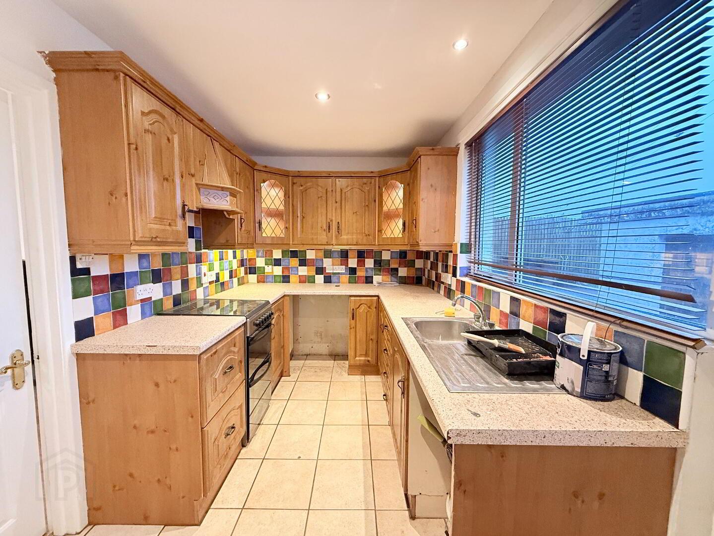 Kitchen: Tiled flooring, U-shaped kitchen with solid wooden high- and low-level units, laminate worktops, and tiled splashback. Cooker, plumbing for white goods, internal storage cupboard, and door to the rear of the property.