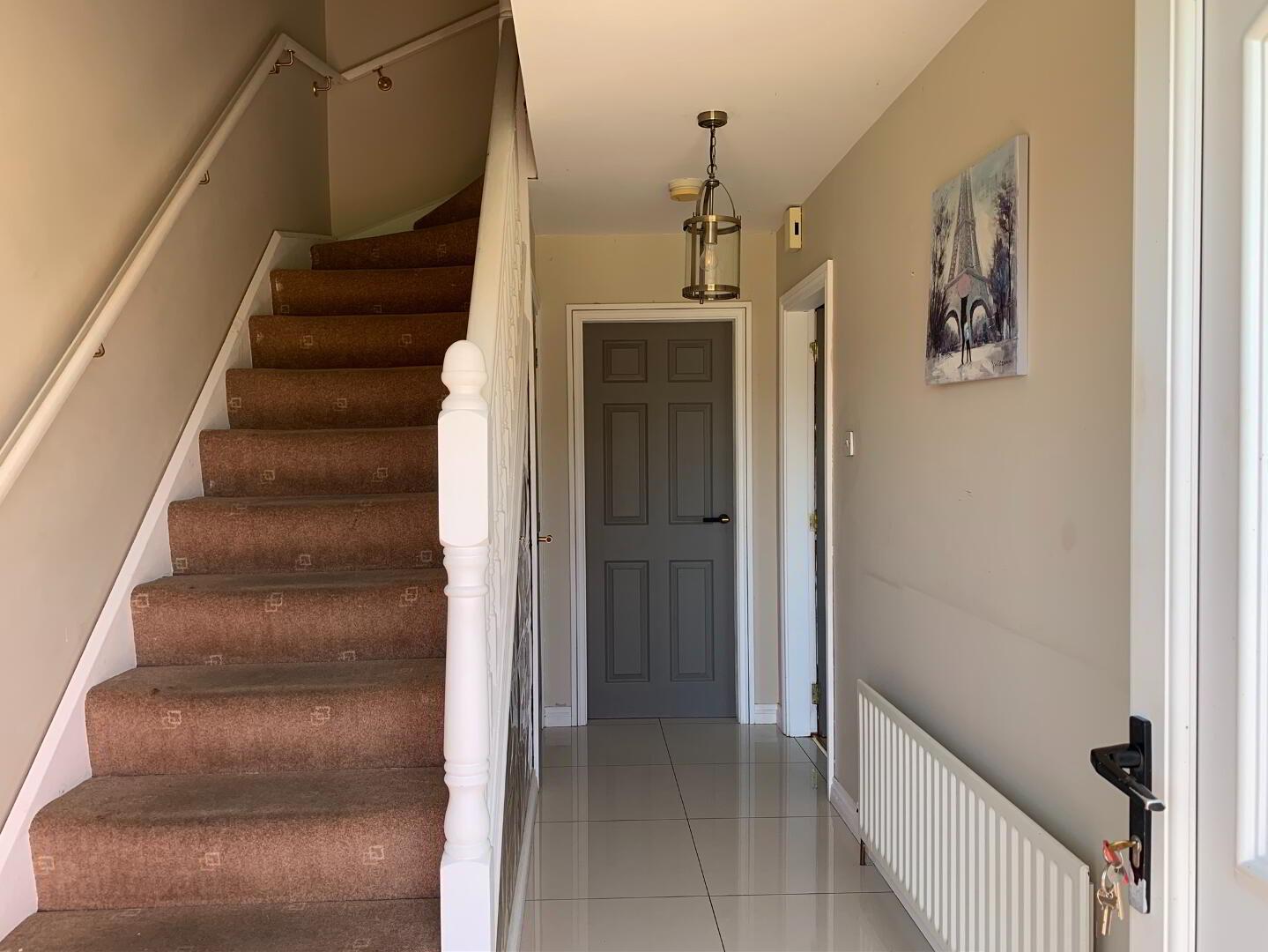 Hall: A bright spacious entrance with cream tile floor and carpet stairwell. Measurements: 4.57m x 2.12m
