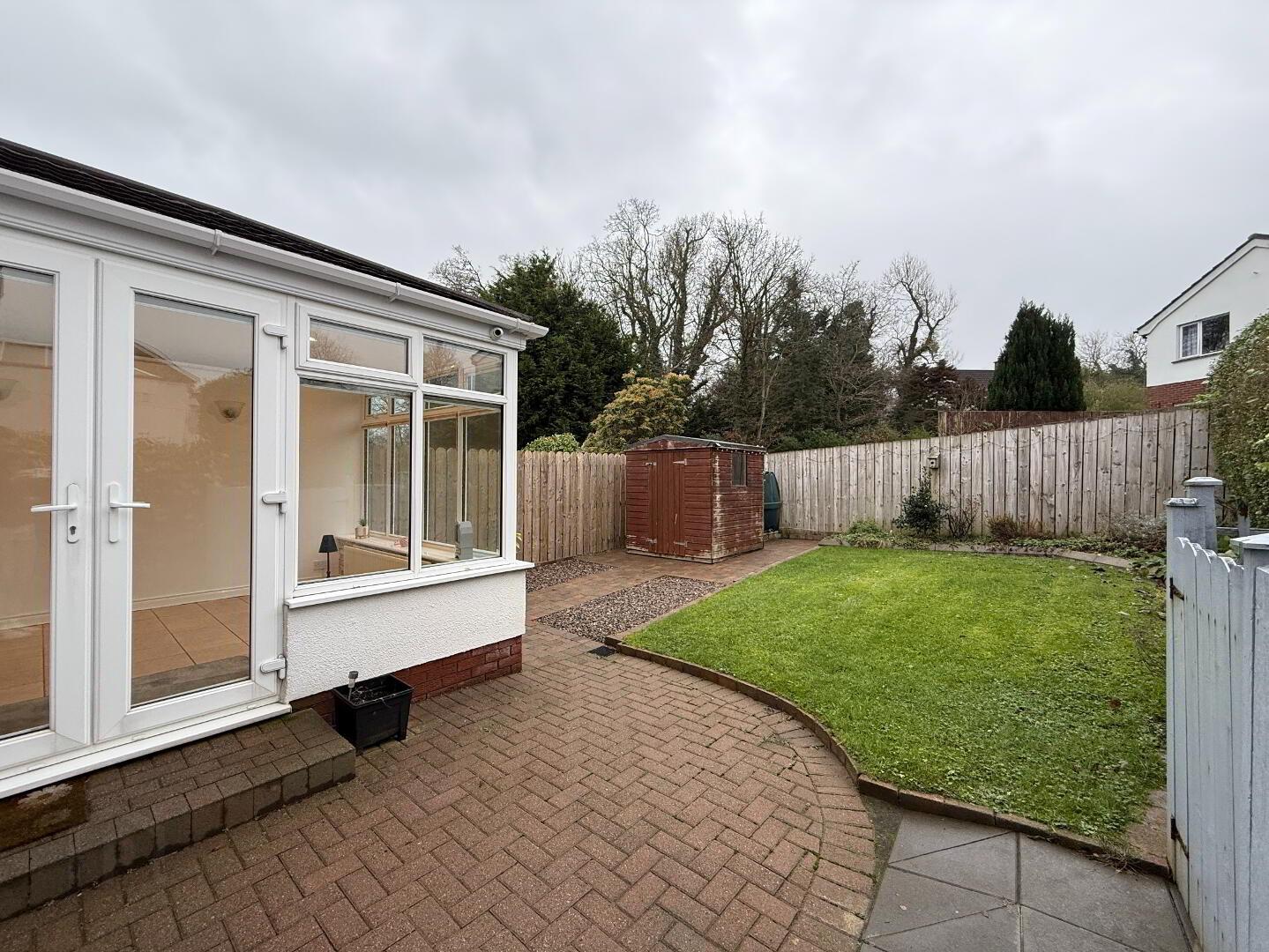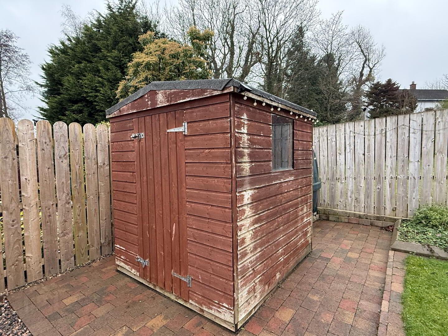 The property benefits from driveway parking with brick paving. To the front is a small garden area laid in lawn with mature shrubbery. The enclosed rear garden features a paved patio area, lawn, boundary fencing, and a garden shed for additional external storage.