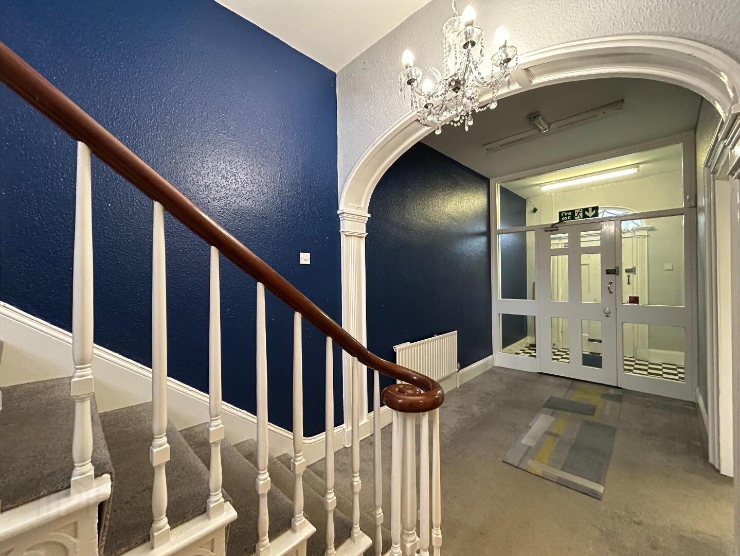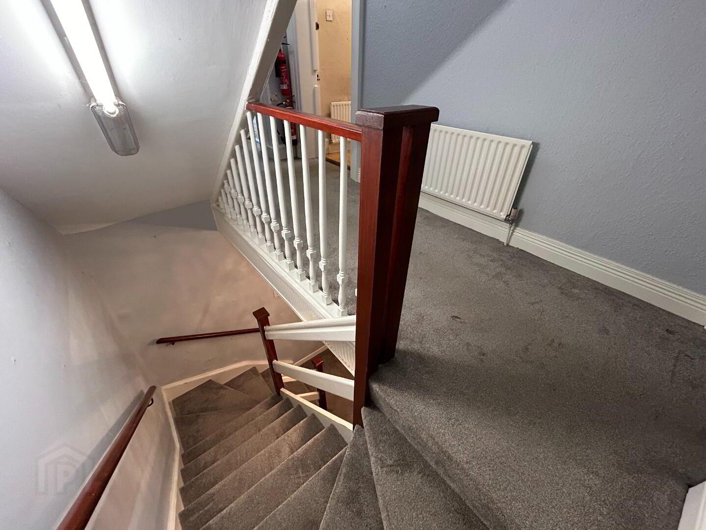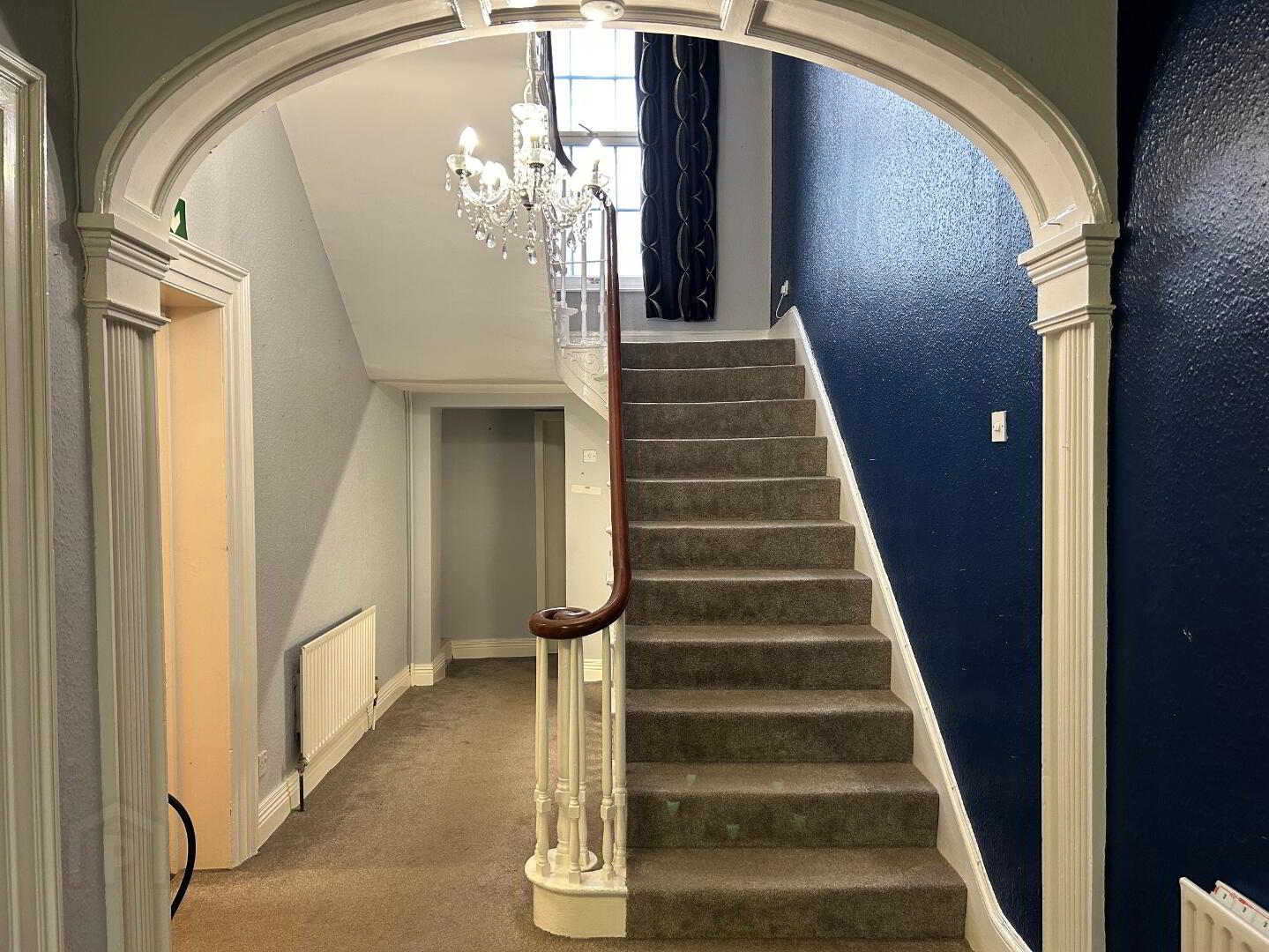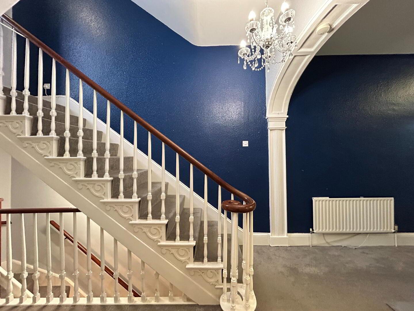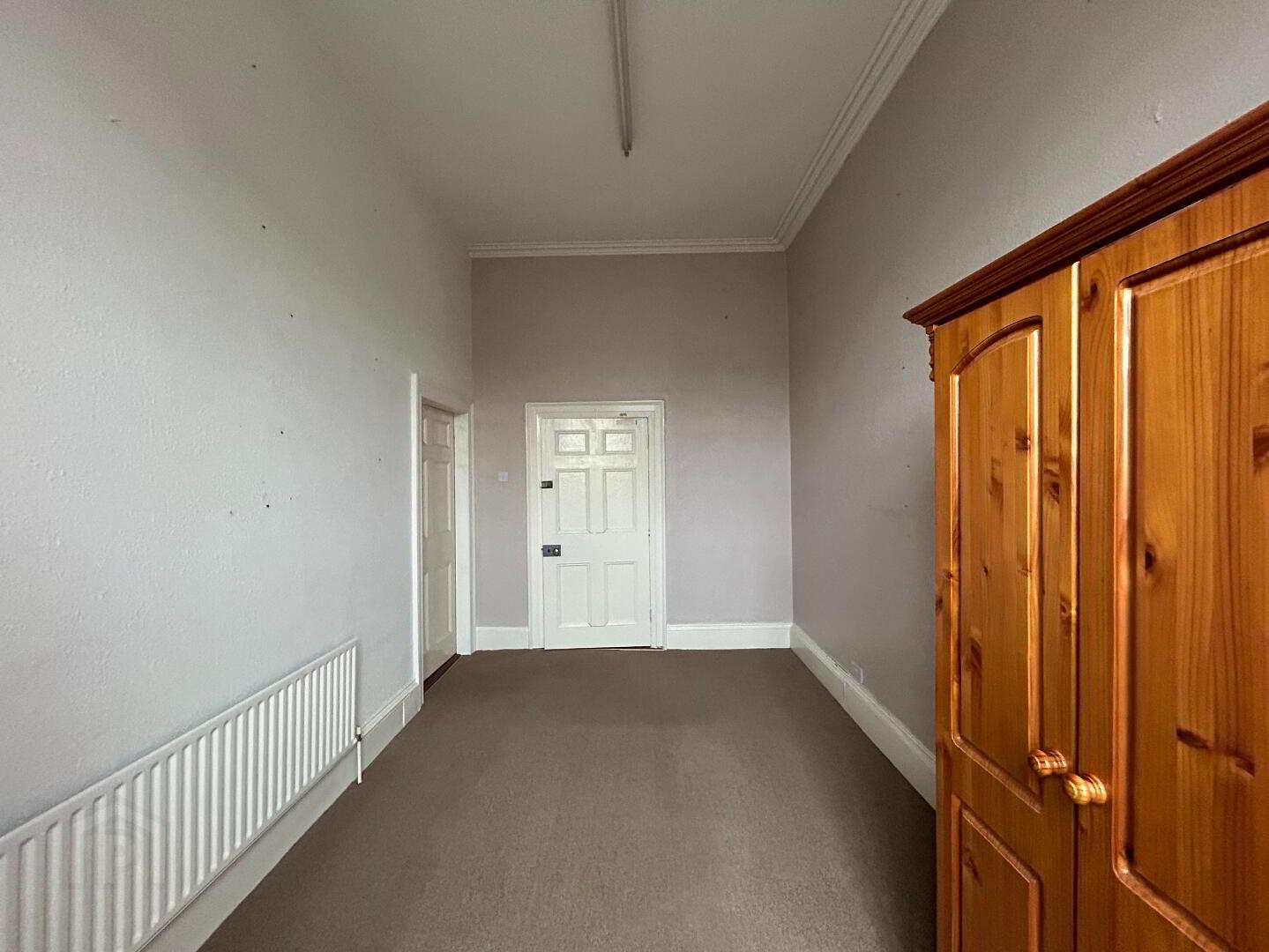 Hallway: Bright, spacious hallway with internal door from porch, carpet flooring leading to stairwell to first floor and basement. Measurements: 8.27m x 2.18m.