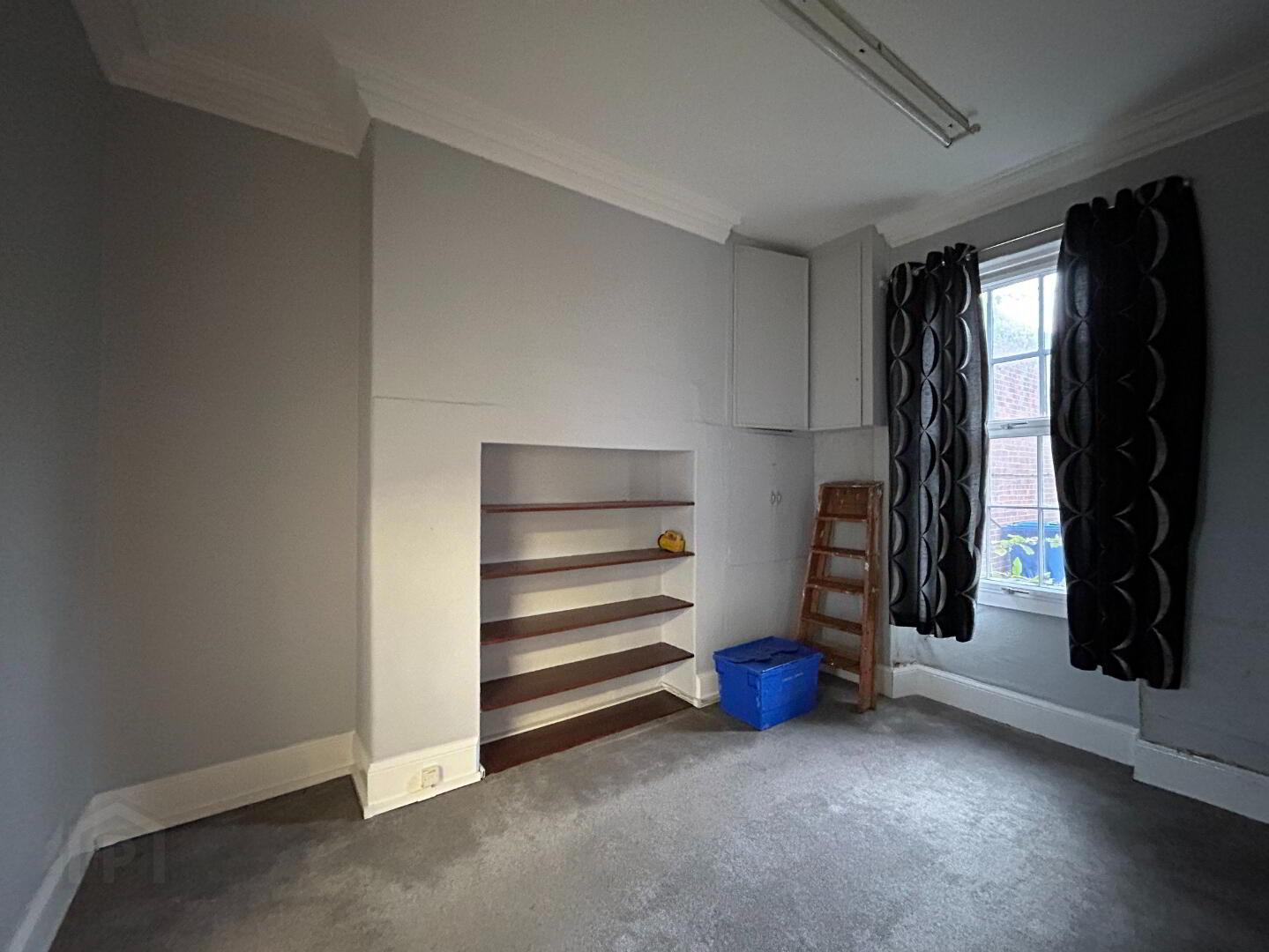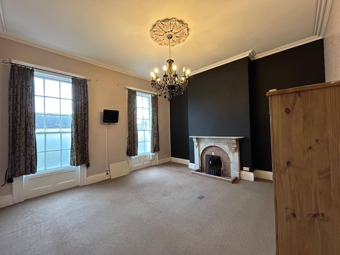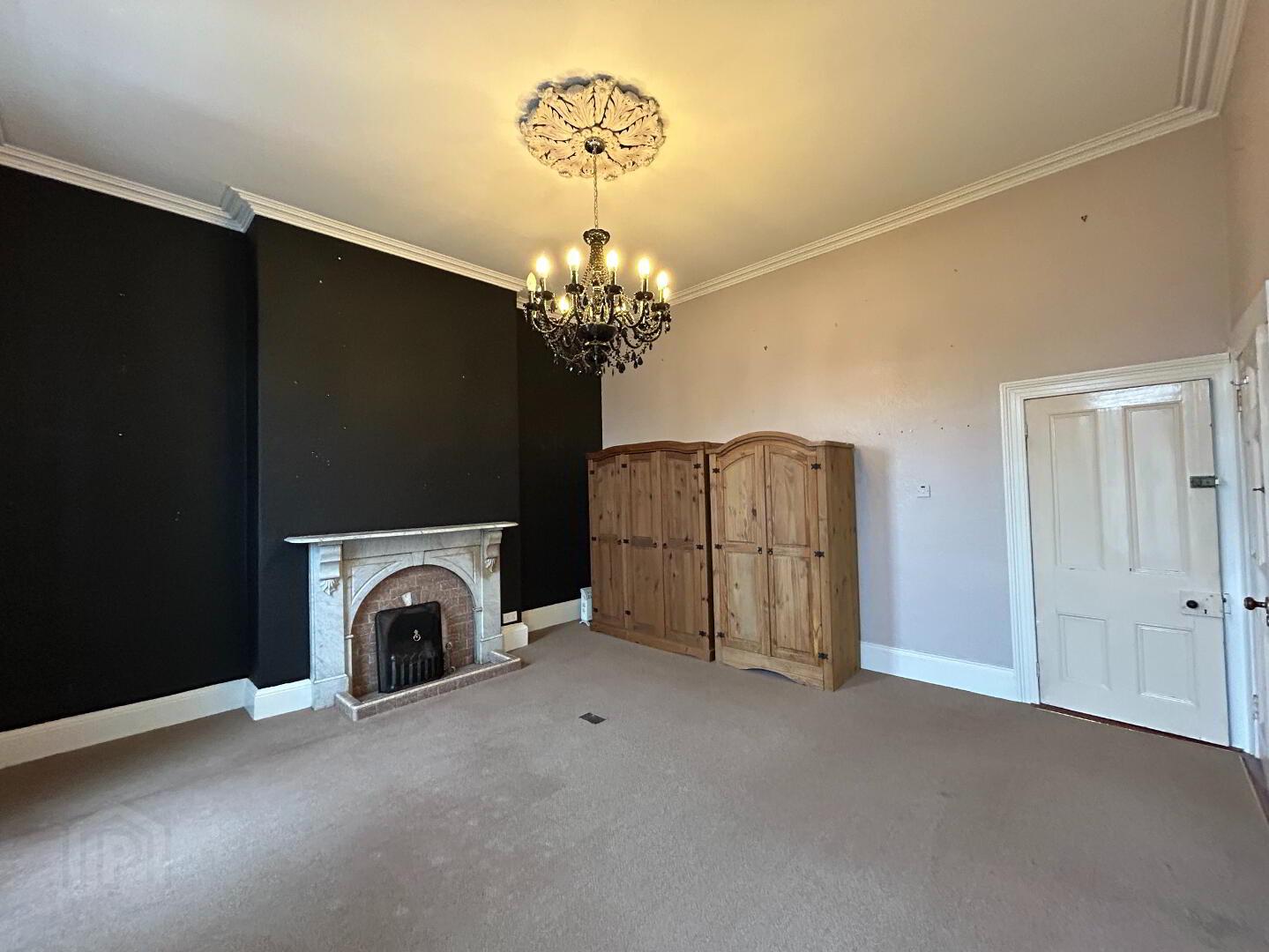 Reception Room: Large front facing reception room with carpet flooring, high ceilings and coving. Measurements: 5.49m x 4.82m.