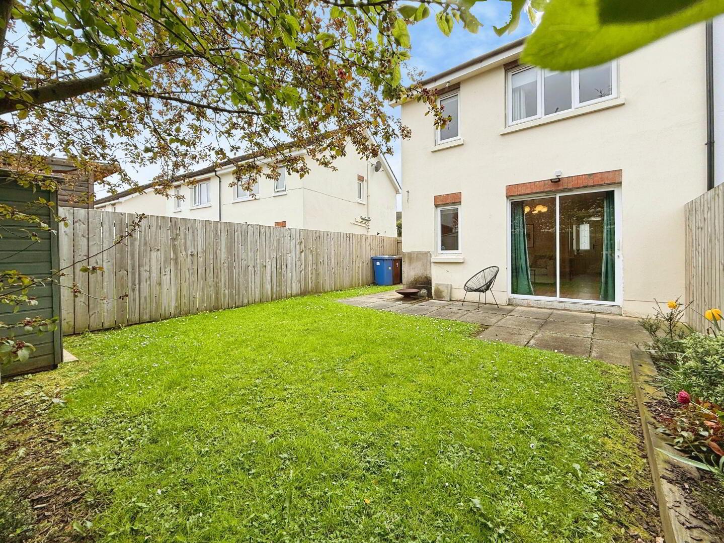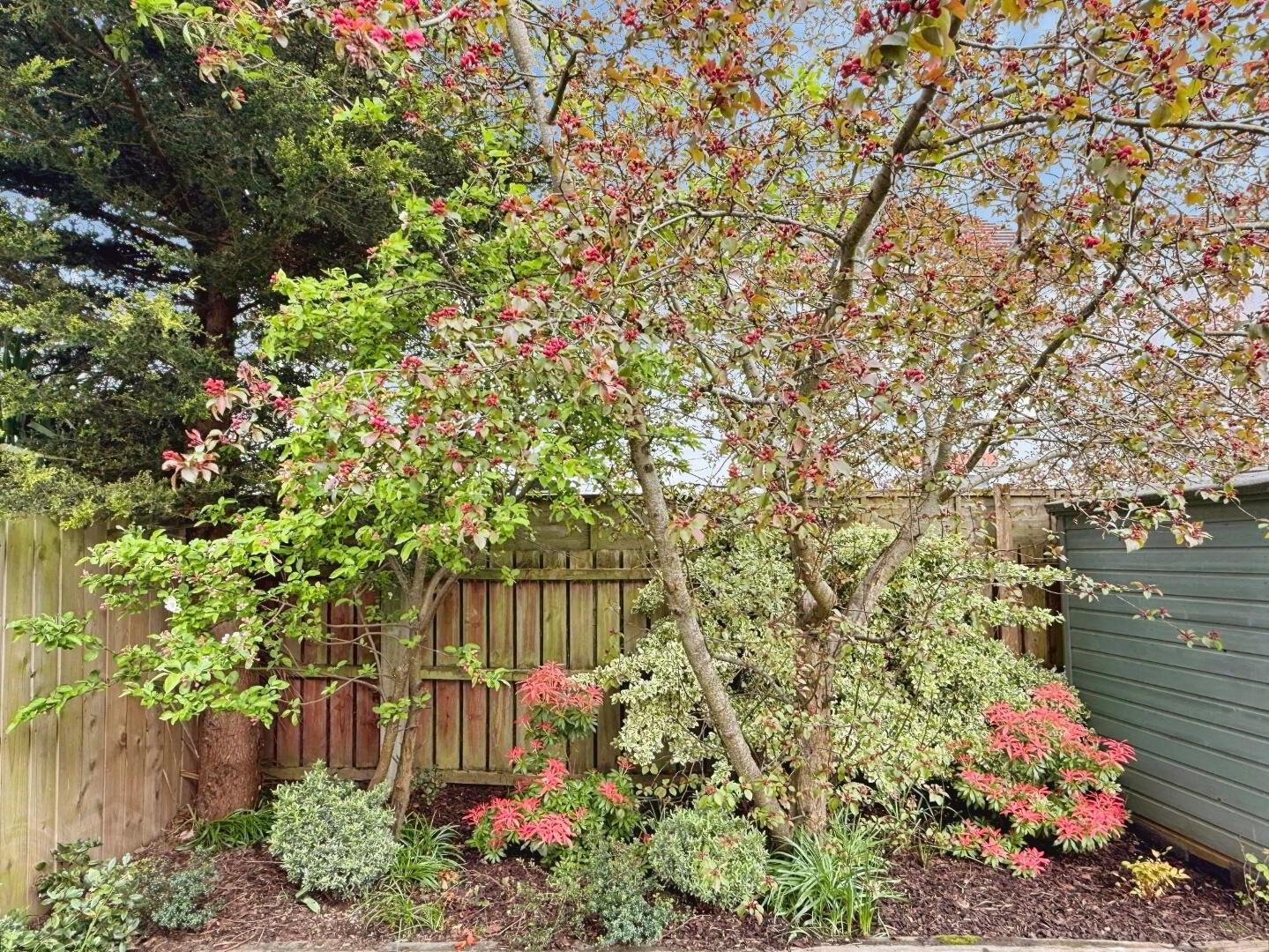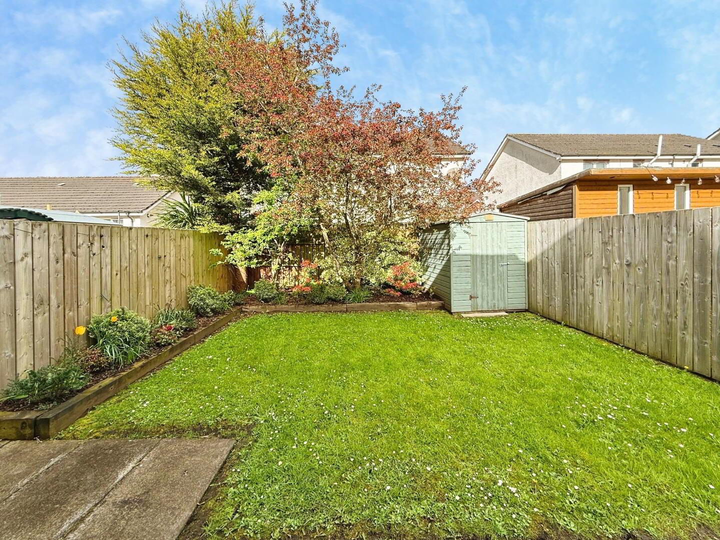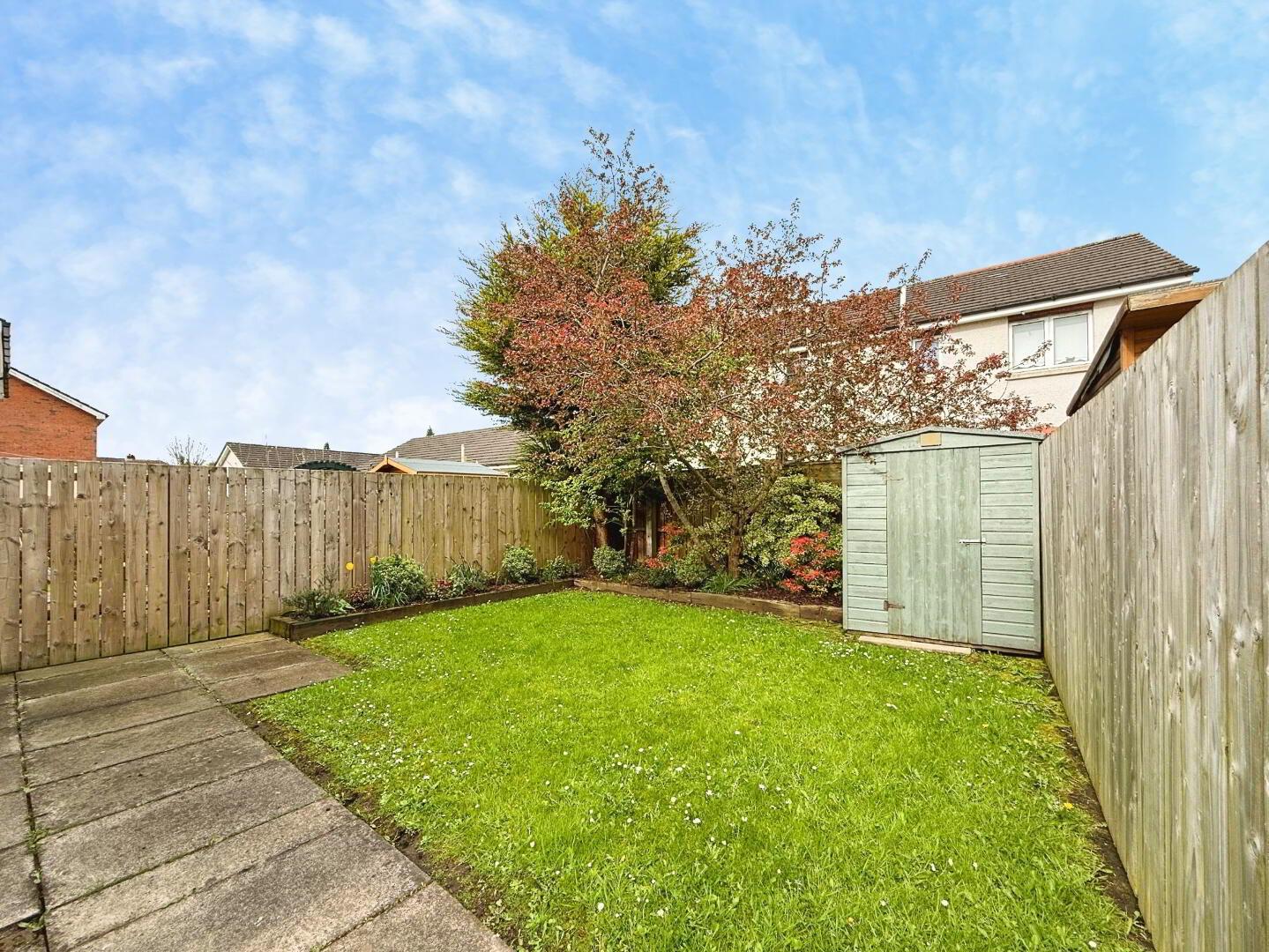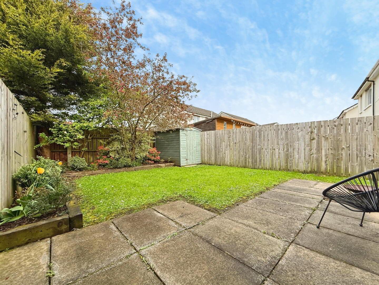 Externally, the property benefits from an asphalt driveway providing off-street parking for two vehicles. A paved pathway leads to the front door, bordered by a small lawn and a mature Rowan tree. To the rear, there is a spacious south-west facing garden, featuring a well-maintained lawn and a paved patio area—ideal for outdoor entertaining and enjoying the afternoon and evening sun. The garden offers a high degree of privacy, enclosed by boundary fencing and enhanced by mature shrubs and floral beds. Additional features include a convenient outdoor power socket and a garden shed, both included in the sale.