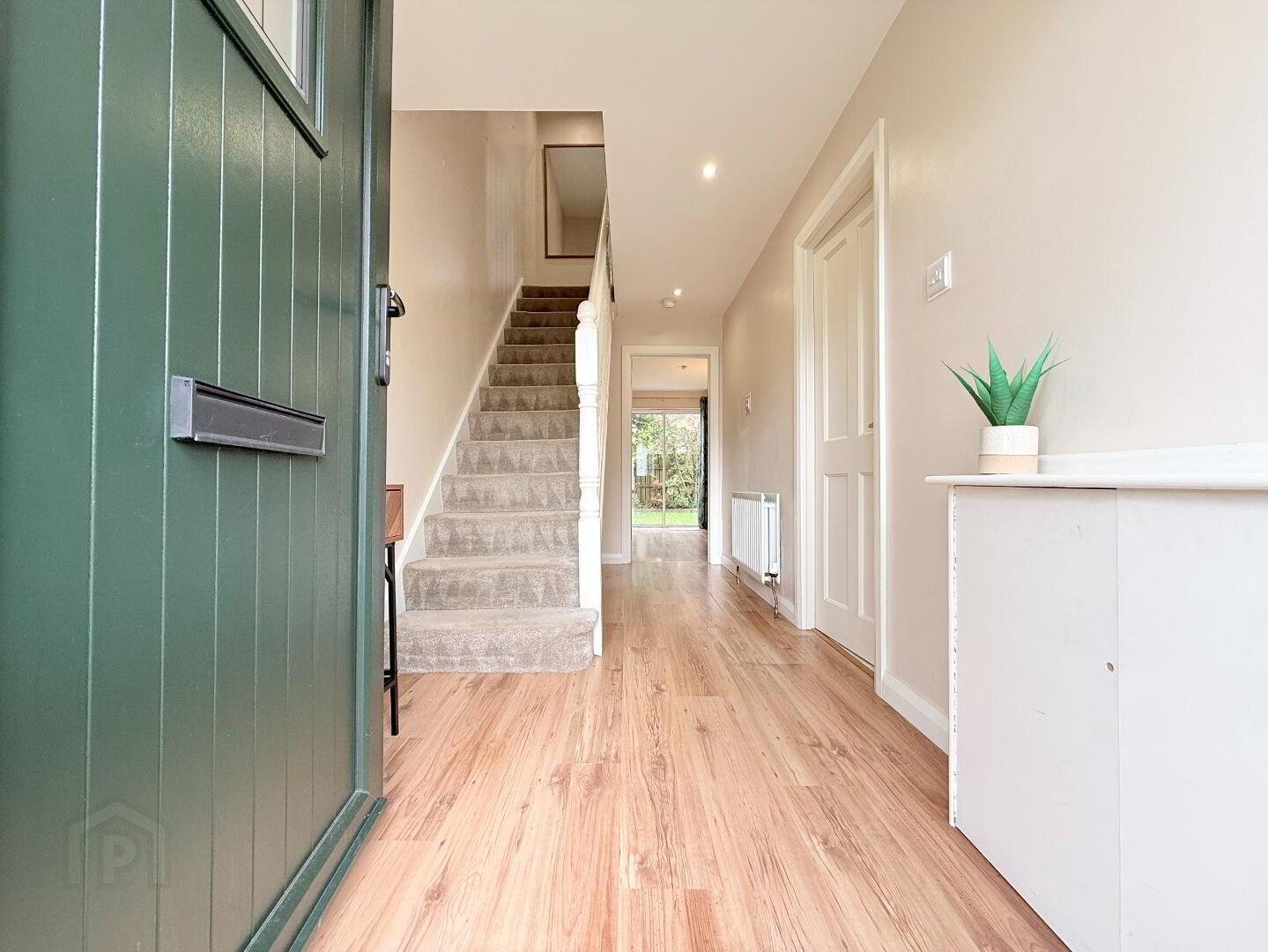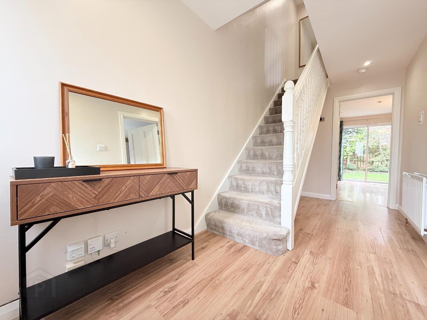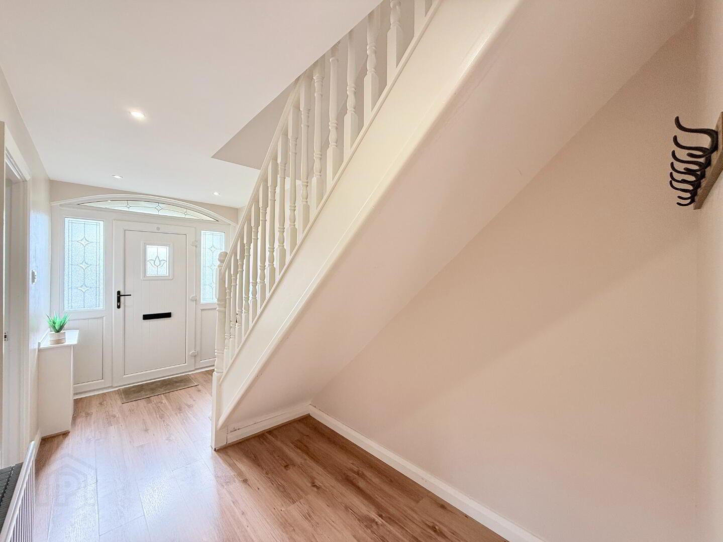 Entrance Hall: A bright entrance hall with composite front door. Impeccable design throughout with laminate flooring; leading to staircase complete with luxurious carpet finish. Measurements: 4.60m x 1.93m.