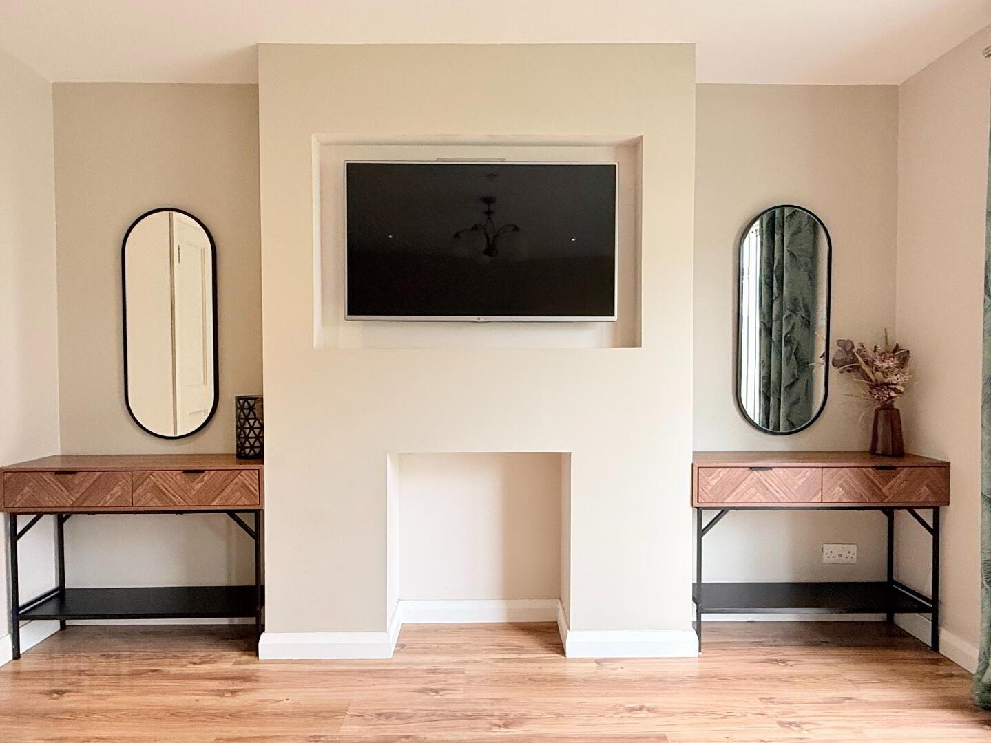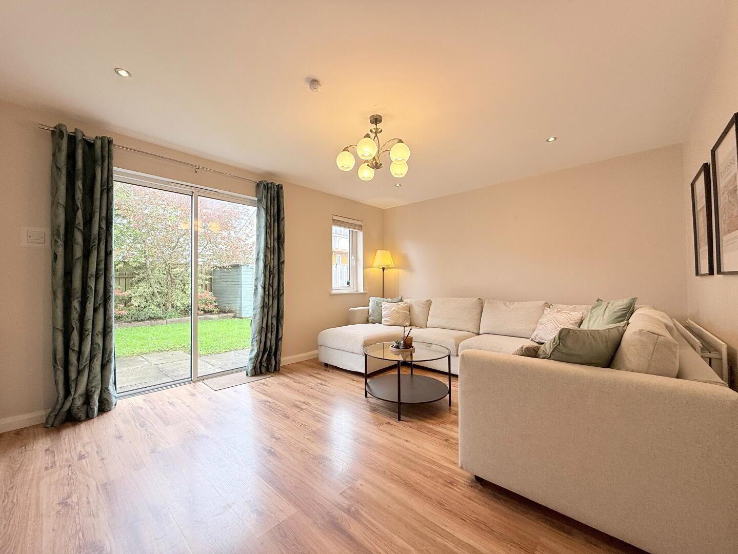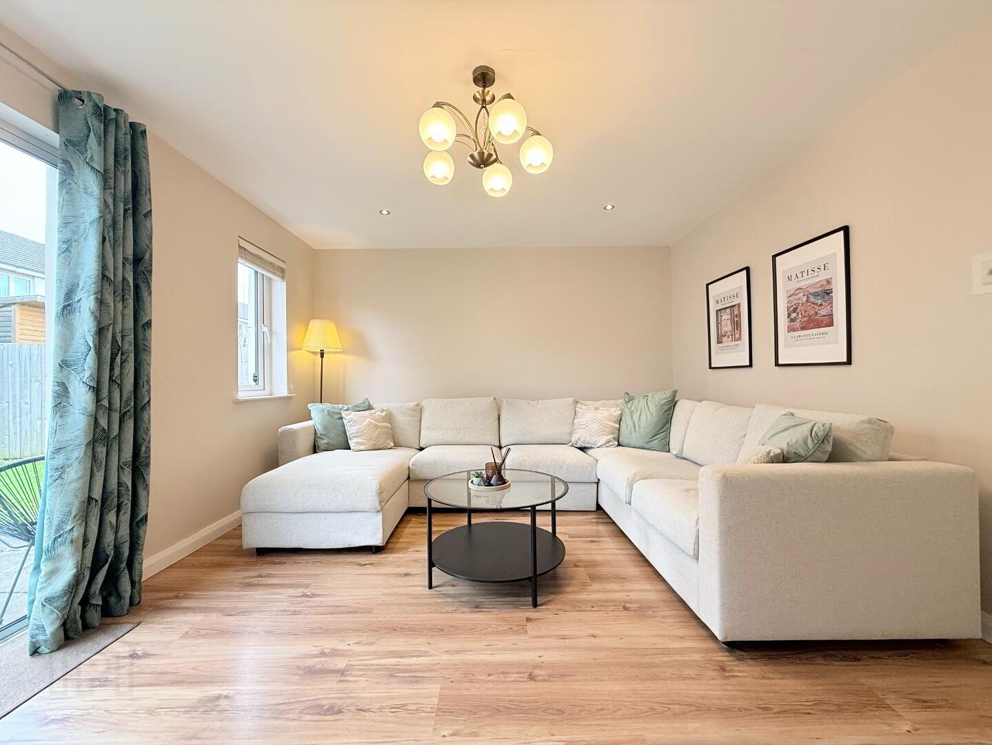 Lounge: An elegant and delicately decorated, spacious reception room with wooden laminate flooring and feature media wall. Sliding patio door provides access to rear garden area. Measurements: 4.69m x 3.67m.