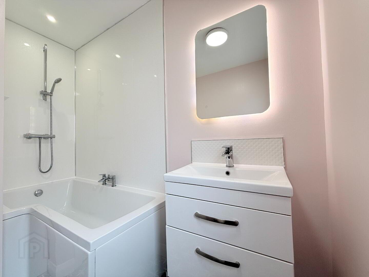 Bathroom: A modern three-piece bathroom suite with tile flooring, vanity unit, LED mirror and power shower over bath. Measurements: 2.69m x 1.88m.
