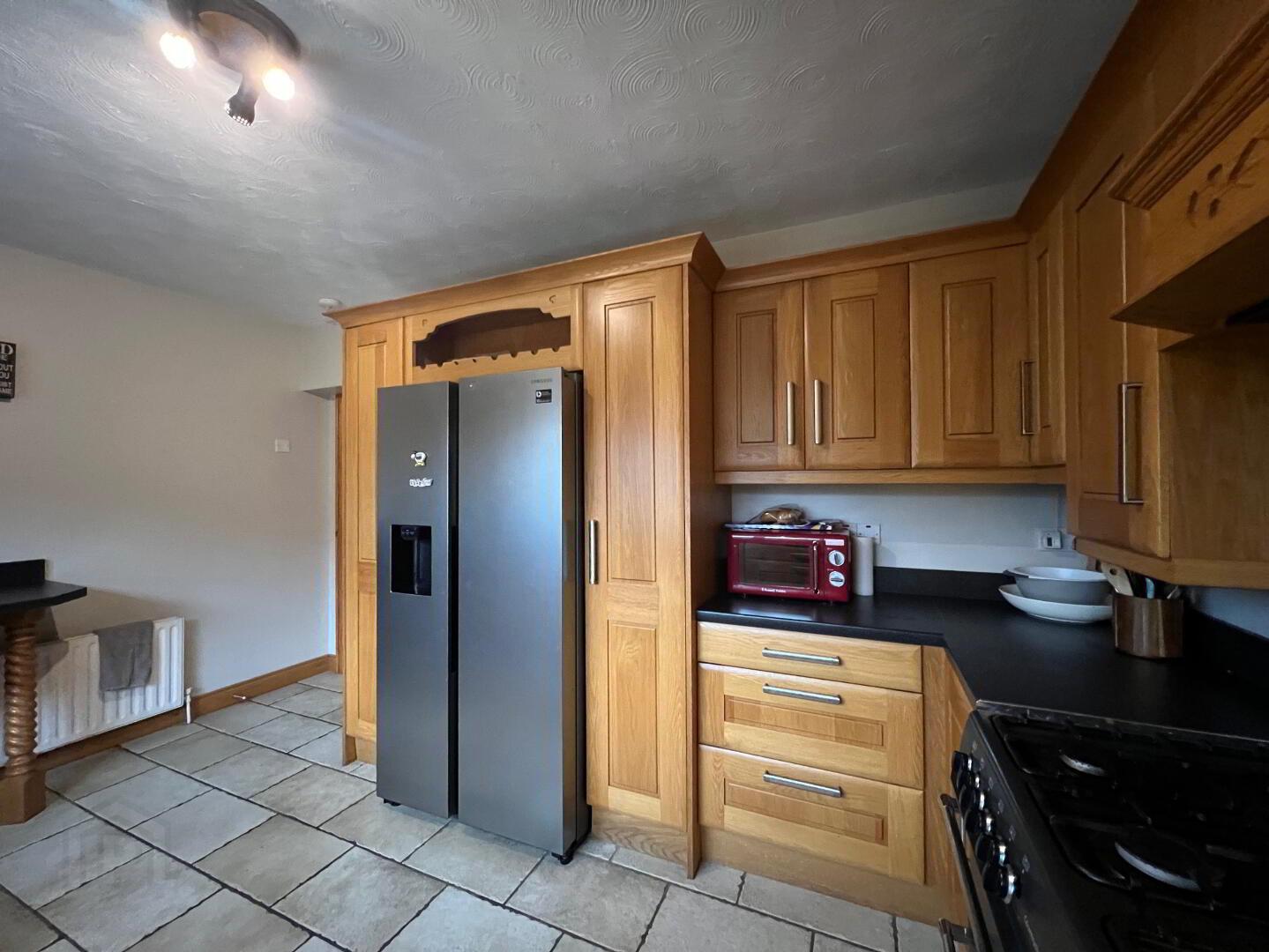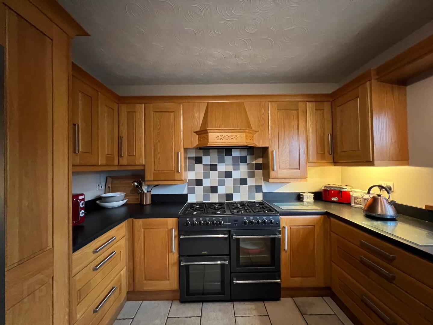 Kitchen: High and low rise country style solid wood kitchen with gas cooker range with breakfast bench.