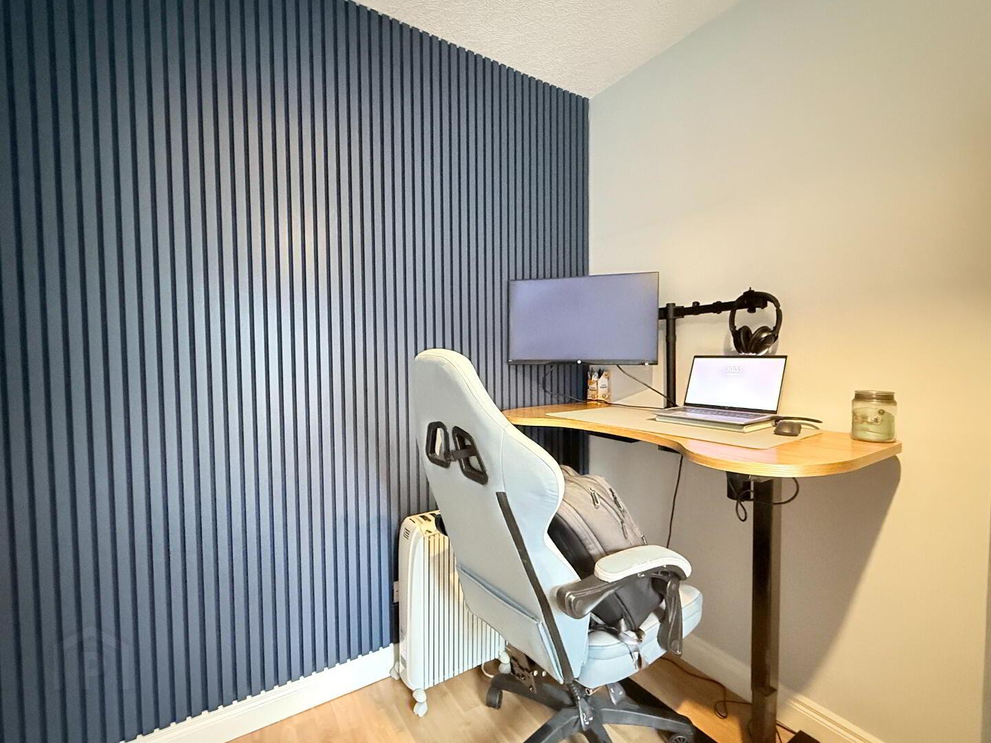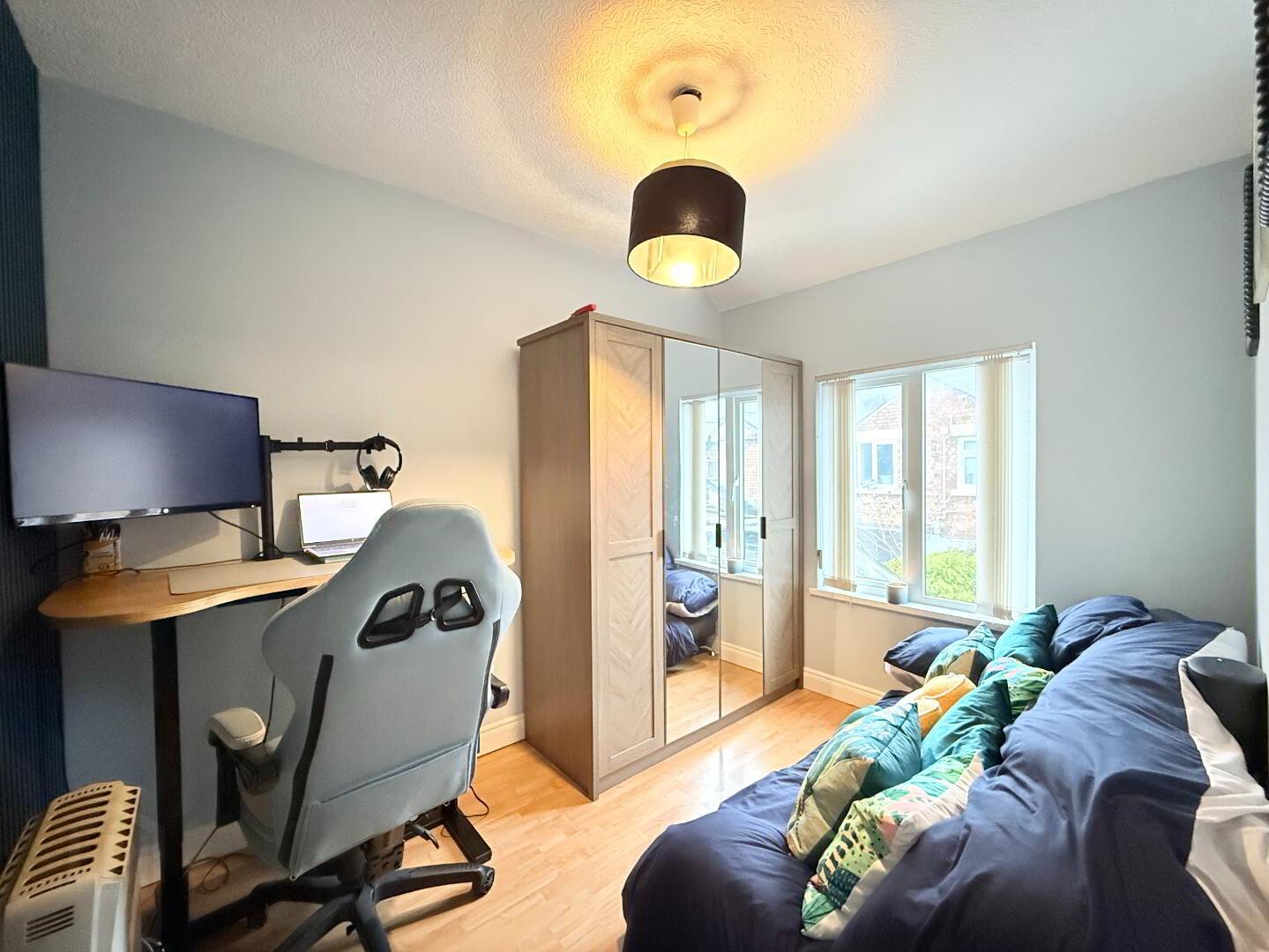 Bedroom 2: A beautiful rear facing double bedroom, laminate flooring a feature wall with wooden panelling. Measurements: 3m x 2.26m.