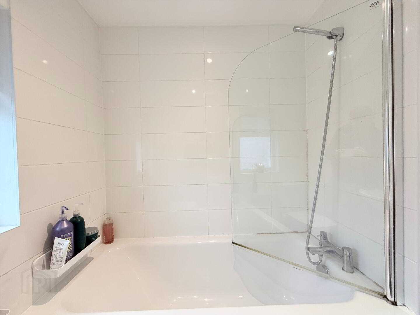 Bathroom: A three-piece bathroom suite with tile flooring and power shower over bath. Measurements: 1.80m x 2m.