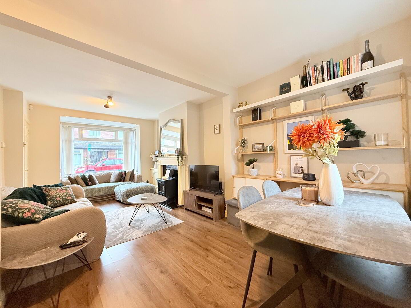 Lounge: An elegant and delicately decorated spacious reception room with laminate flooring and feature bay window. Fireplace with electric fire, leading to open plan dining area.