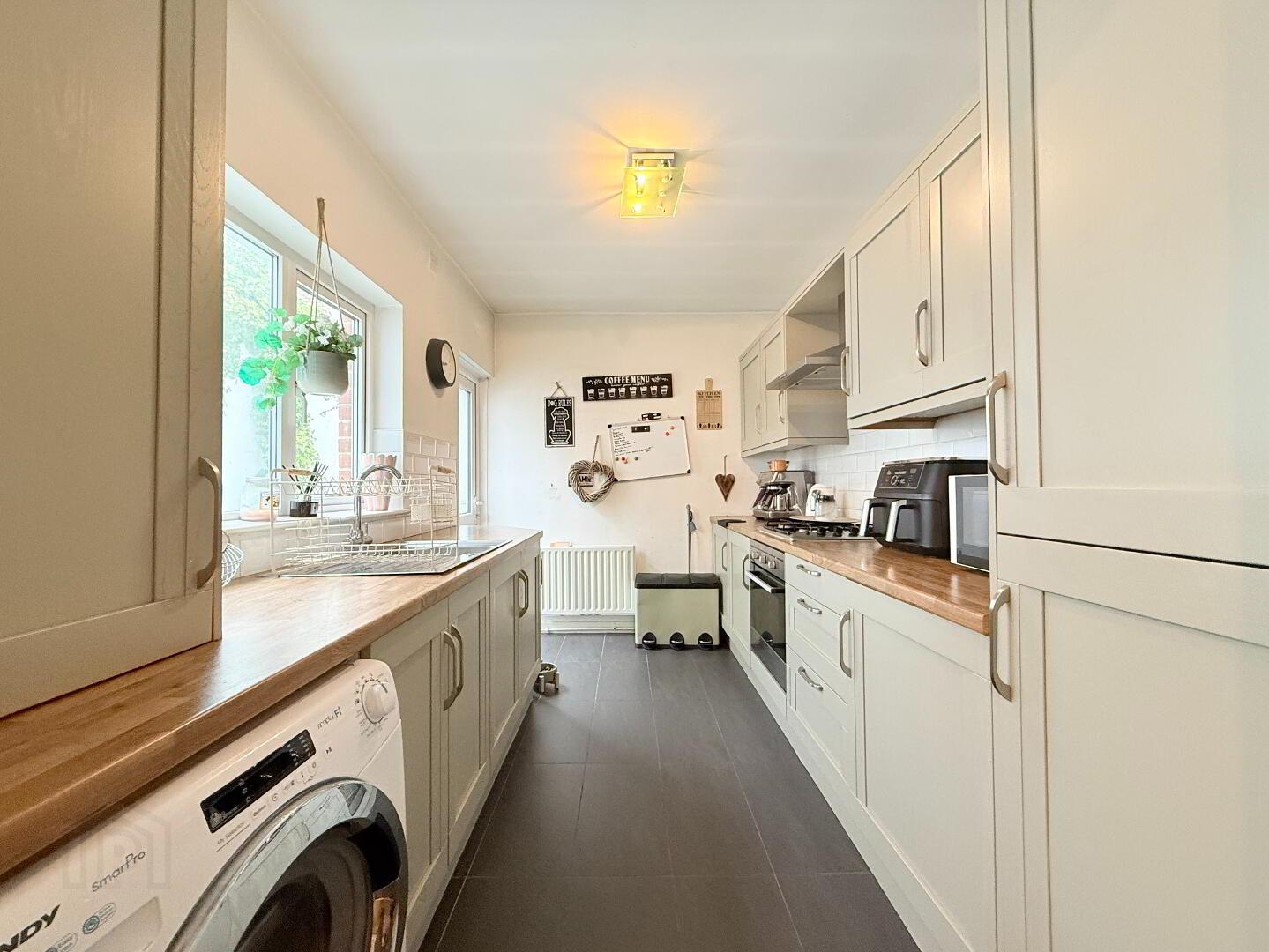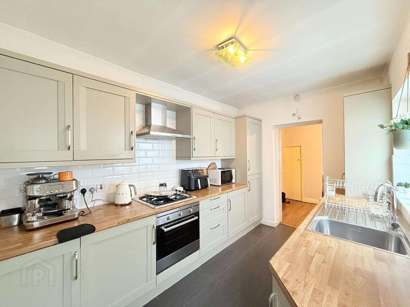 Kitchen: A high specification kitchen with low and high rise units, laminate worktop and tile splash back. The kitchen enjoys the following integrated appliances: 4 ring gas hob, oven, and fridge / freezer with services in place for washing machine. Kitchen is complete with tile flooring and rear door access to back yard. Measurements: 5.22m x 2.36m.