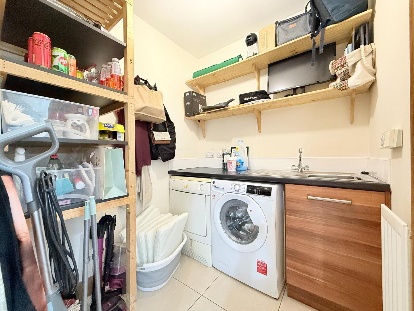 Located off the kitchen, tiled flooring with low level unit and laminate worktop, plumbing for a washing machine and tumble dryer.