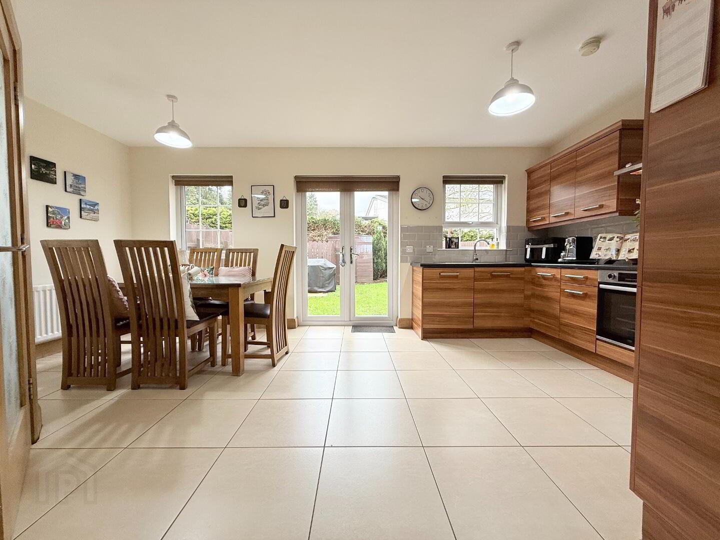 Spacious open-plan area with tiled flooring throughout and French patio doors leading to rear garden. The beautiful U-shaped kitchen is fitted with high- and low-level units, laminate worktop and tiled splashback. Integrated appliances include a fridge/freezer, dishwasher, four-ring hob, and oven.