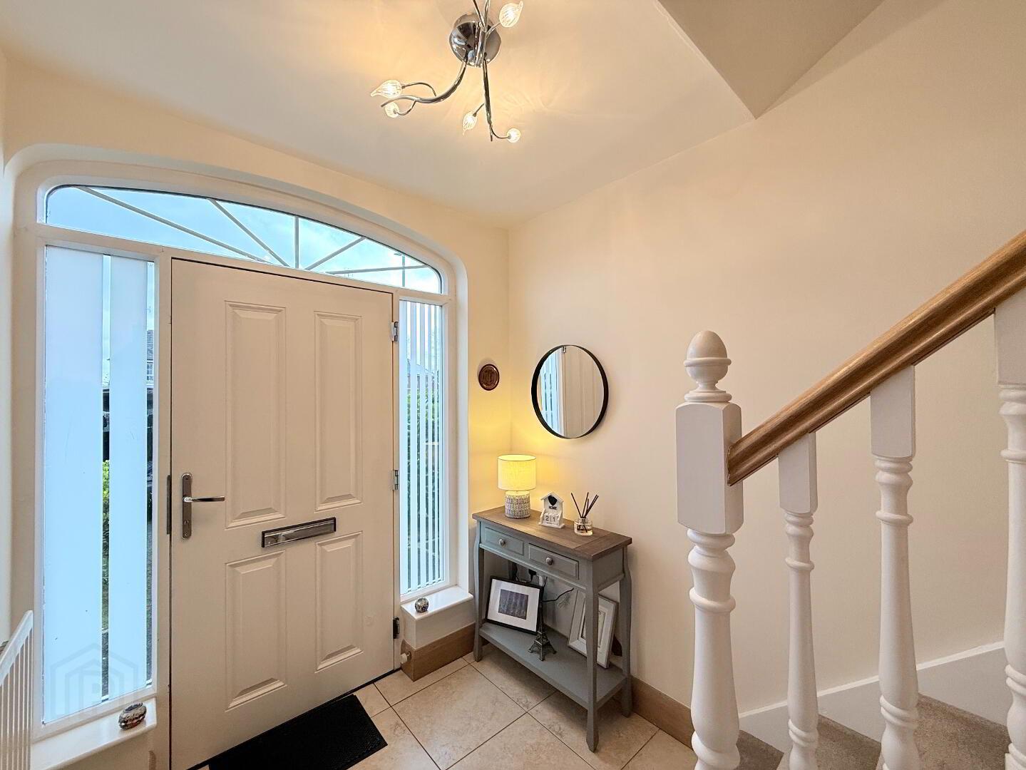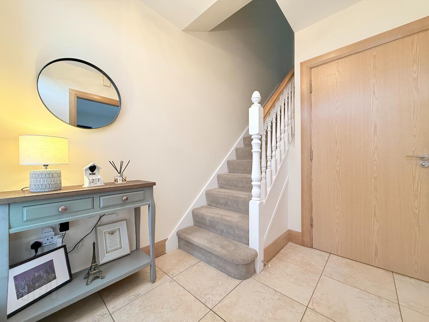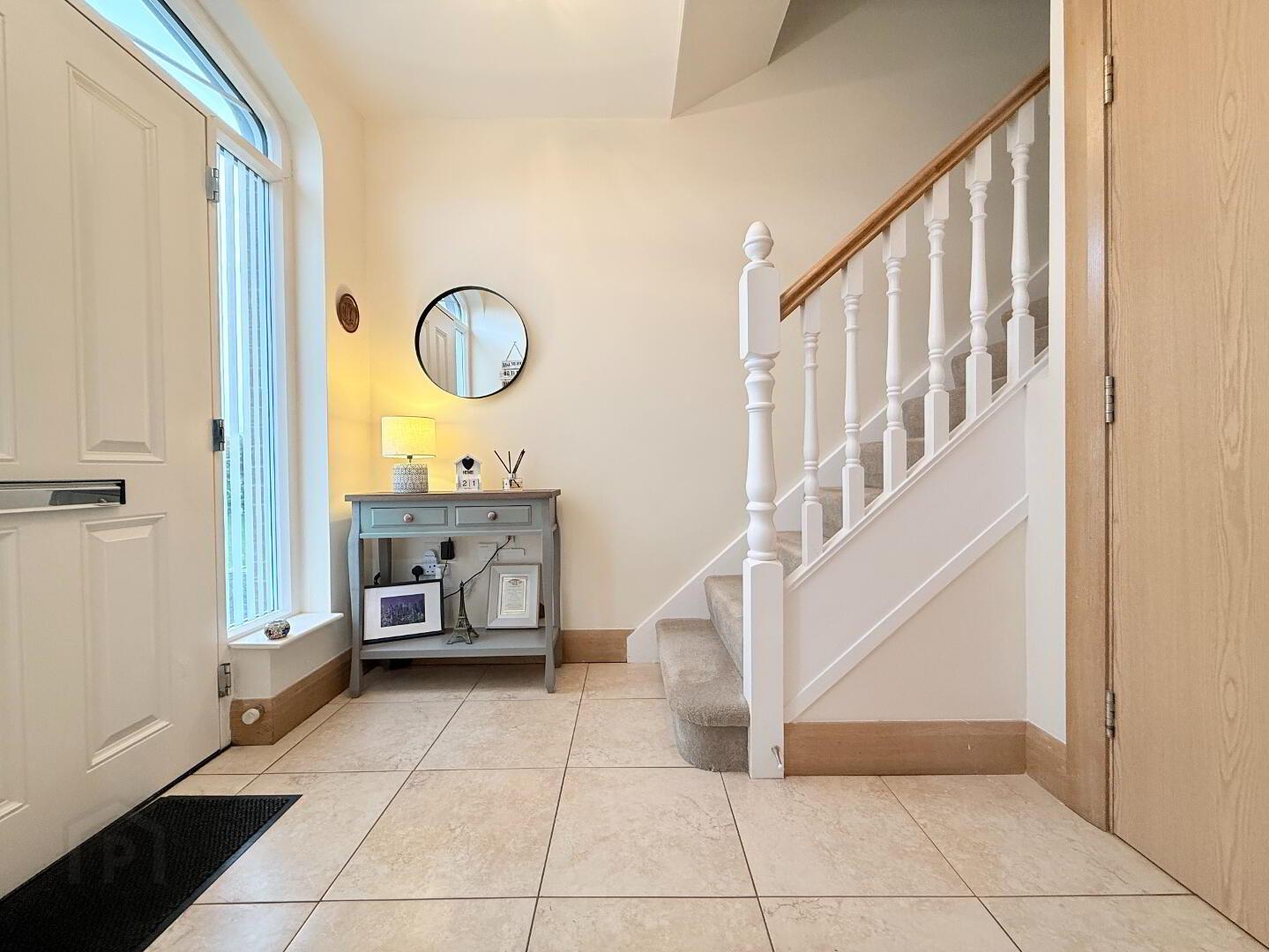 Bright and spacious entrance hall with composite front door, tiled flooring, leading to luxurious carpet stairwell. Measurements: 2m x 2.32m.