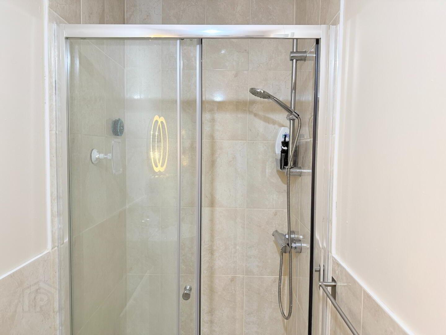 Three-piece suite with tiled flooring and power shower. Measurements: 3.77m x 0.97m.