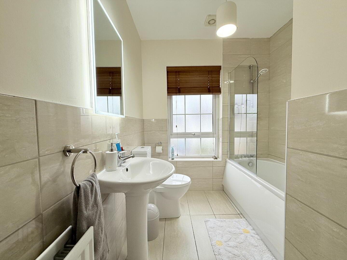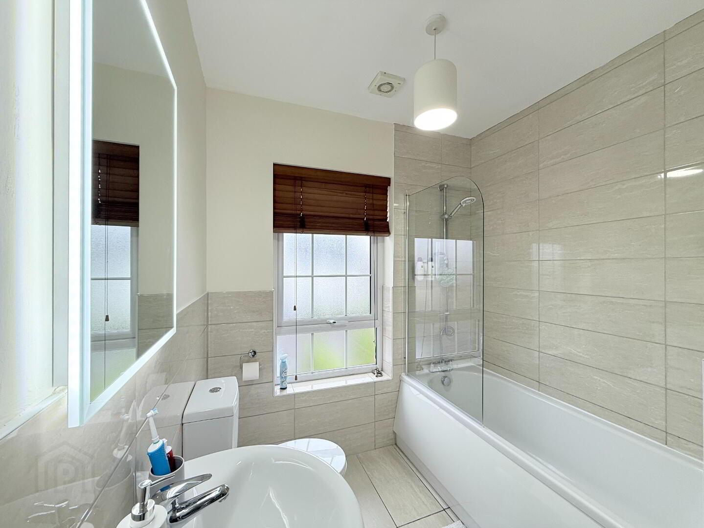 Stylish three-piece suite with high-quality sanitary ware, tiled flooring and walling, power shower over bath.