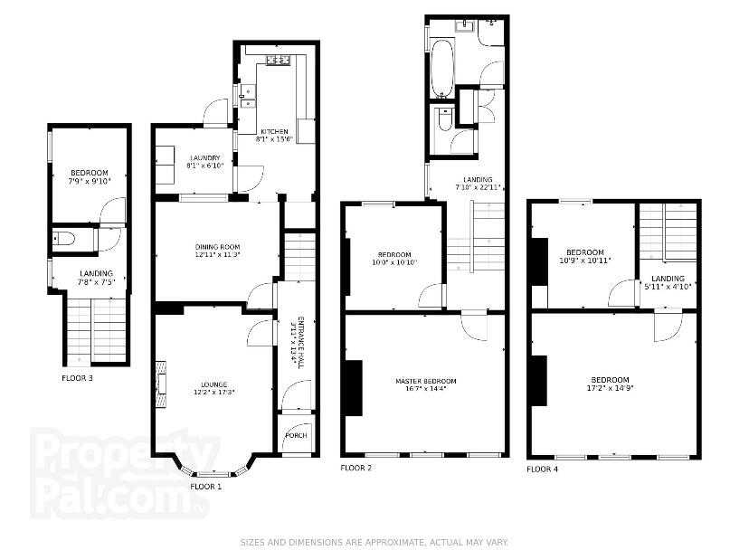 Upstairs the first floor has two large bedrooms, w/c and main family bathroom. The second floor has two large bedrooms. The third floor has w/c and one further bedroom offering fantastic space.