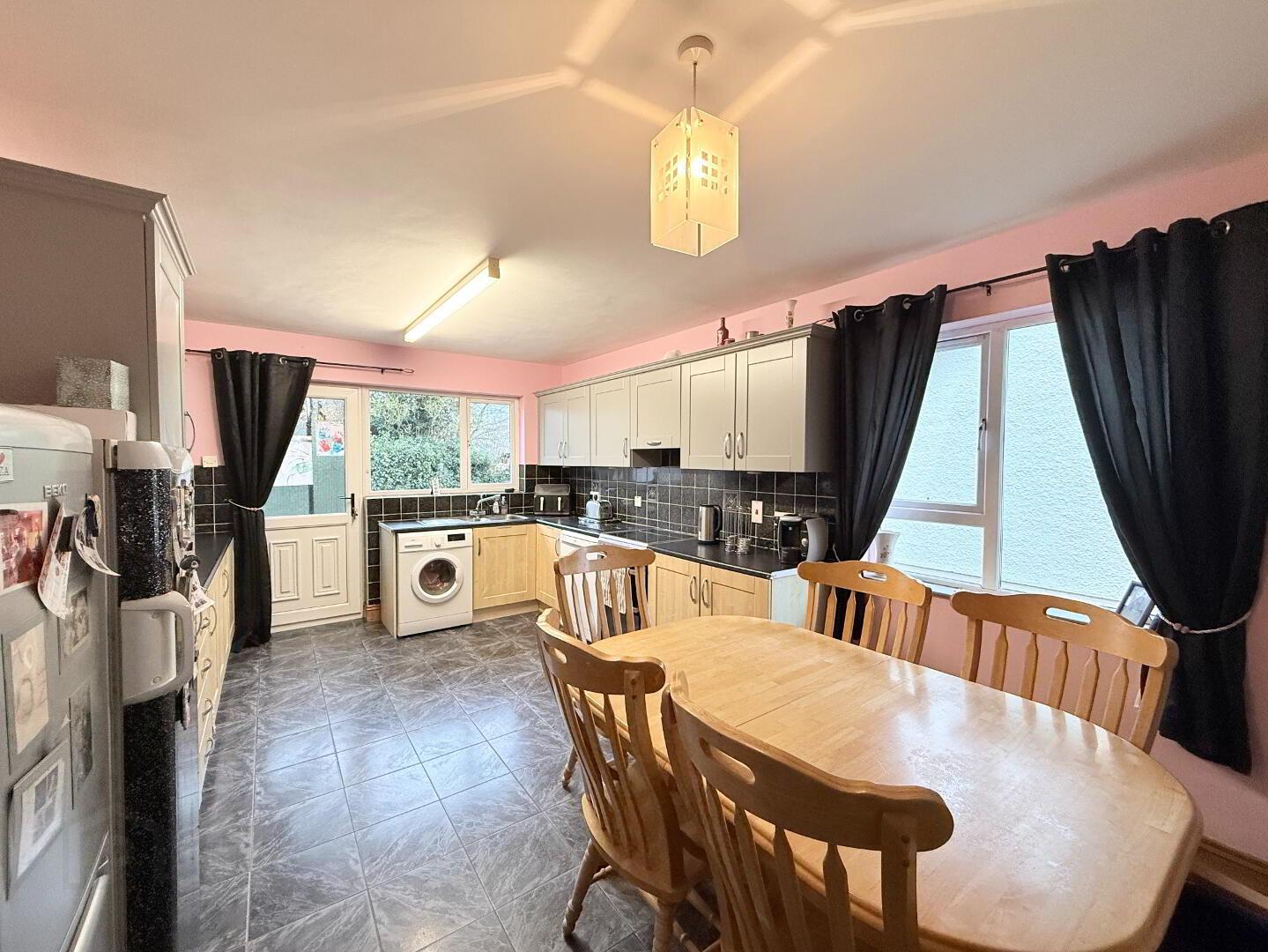 Generous open-plan kitchen and dining space with tiled flooring, a range of high and low-level units, laminate worktops, tiled splashback, plumbing for appliances and rear access door.