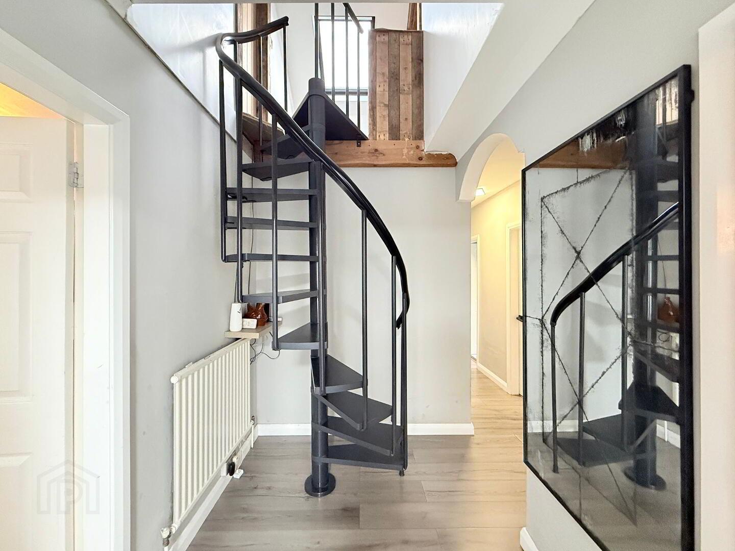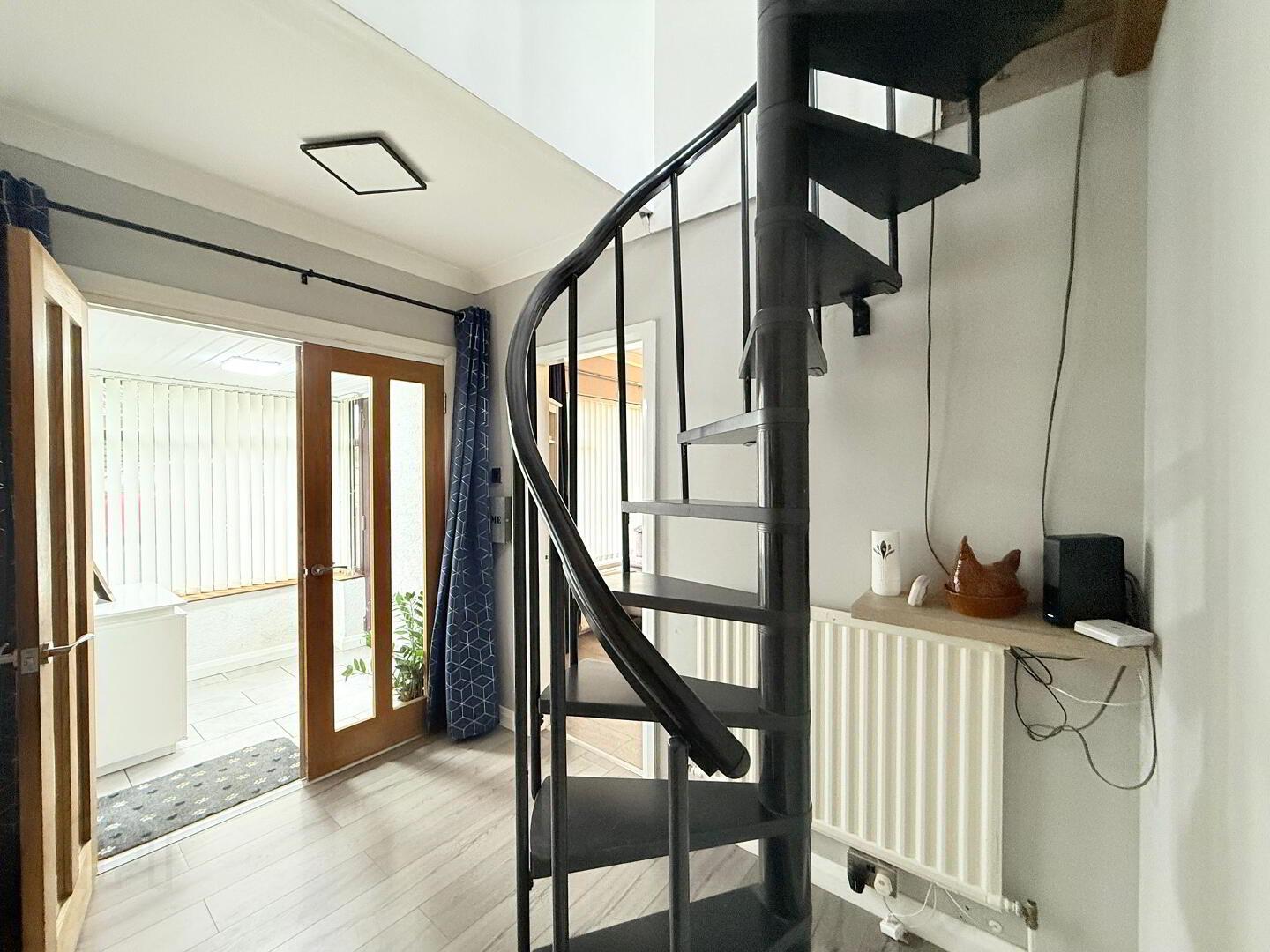 Hallway: A spacious hallway with spiral stairwell to the roofspace; tiled flooring; with access to lounge, kitchen bathroom and bedrooms.