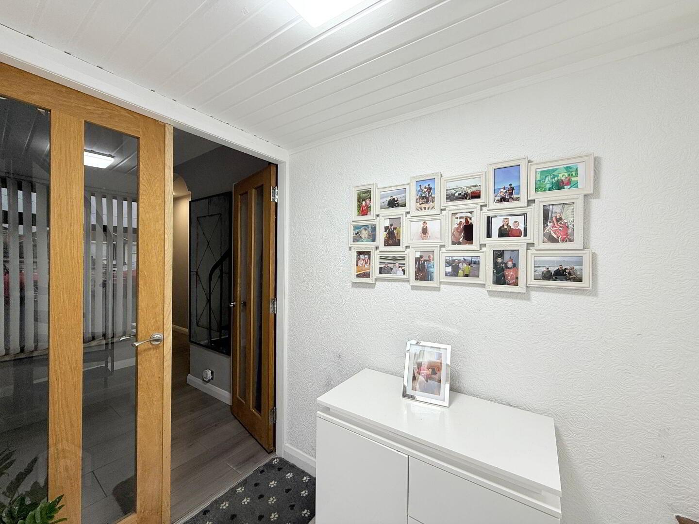 Entrance Porch: A bright welcoming entrance with uPVC door; uPVC double glazed windows; tile flooring; leading to glazed oak french doors into the hallway.